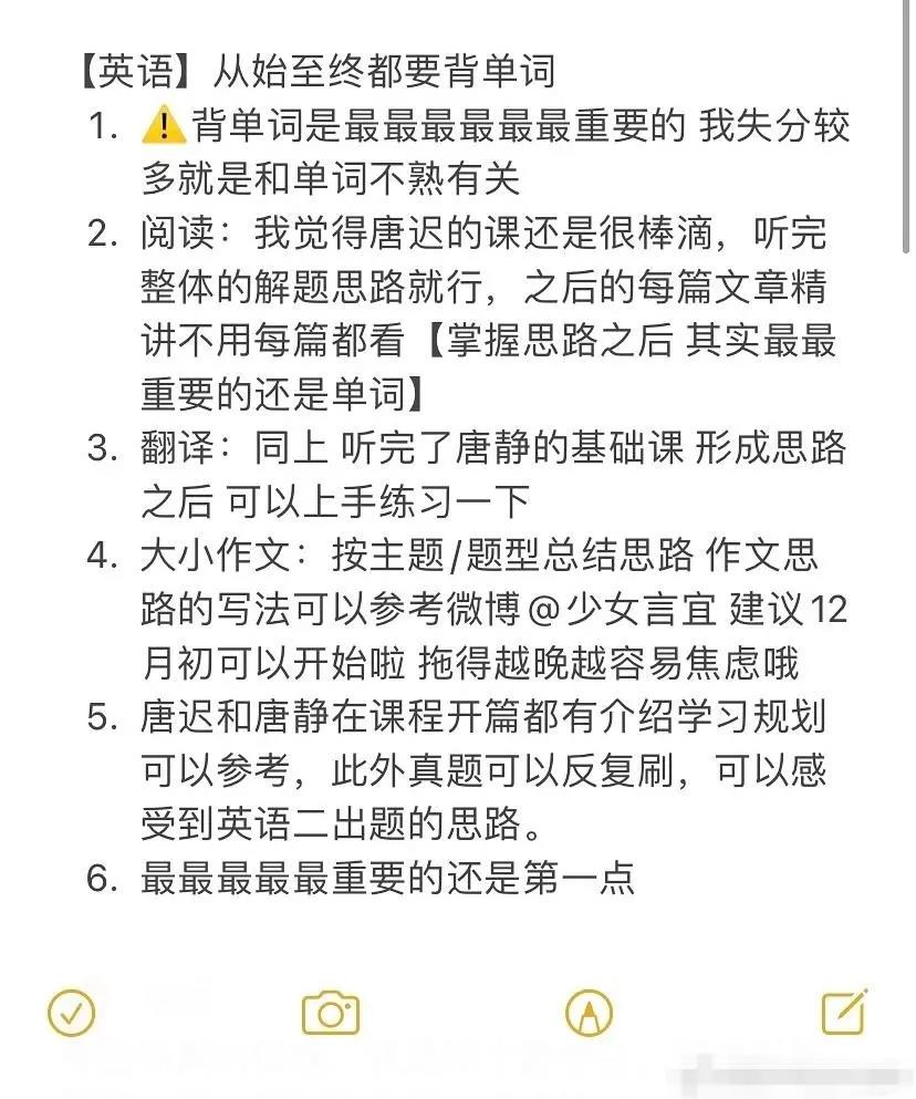 英語:熟記單詞很重要,推薦唐遲和唐靜的課。作文提前開始,準備積累素材。
