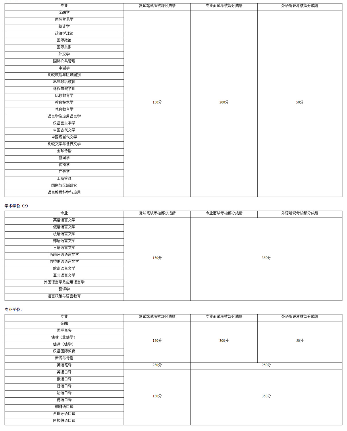 復試滿分為500分,各專業(yè)分值比例如下(復試筆試、專業(yè)面試、外語聽說考試成績均按百分制給分,在計算復試總成績的時候?qū)⑦M行自動折算):