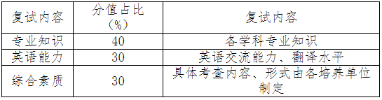 復試由各培養單位組織開展。復試主要是考核考生綜合運用專業知識分析和解決問題的能力、評判思維能力、舉止和語言表達能力、人文素養、心理素質等,實行百分制計分,包括專業知識、英語能力、綜合素質。具體各項賦值及復試內容見下表。