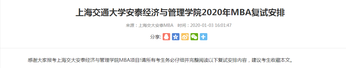 以上就是“2020MBA復試公告:上海交通大學安泰經濟與管理學院MBA復試工作安排通知”的全部內容,更多考研復試信息,請多多關注考研網!祝您考研成功!