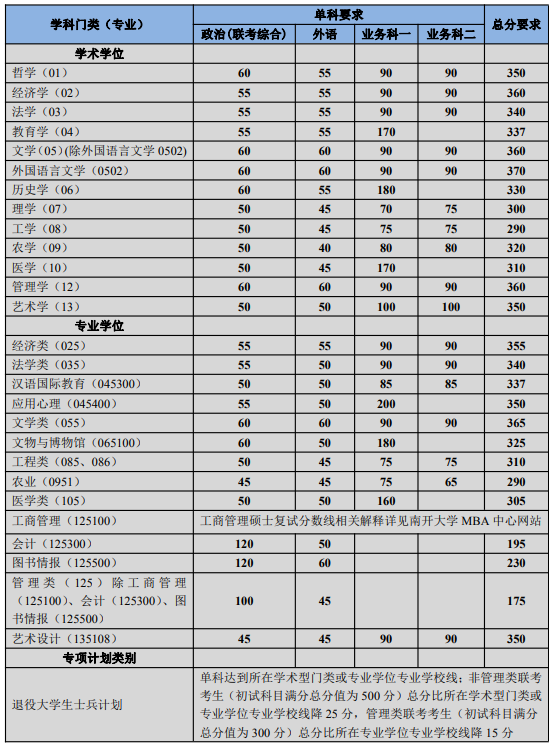 1、 以上進入復試的初試成績基本要求為我校統考、聯考生復試最低線。有關學院根據生源情況可在此基礎上上調部分或全部專業的單科或總分線,詳細情況請見南開大學研招網。