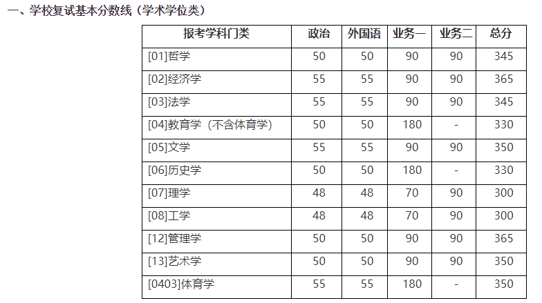 說明:此復試基本分數線只是我校復試的最低分數要求,接受報考的學部院系可根據整體考試情況、招生計劃、學科專業特點等,上調分數要求。考生須同時達到學校復試基本分數線和報考學部院系調整設定的復試分數線,才有資格參加復試。學部院系調整設定的復試分數線和復試辦法,另行通知。