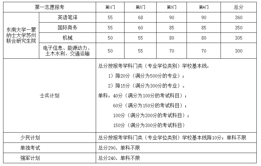 2. 統考考生(不含報考東南大學-蒙納士大學蘇州聯合研究生院考生和管理類聯考考生)總分超過報考院(系)專業復試線20分以上(含20分),單科(限一門)可降2分。