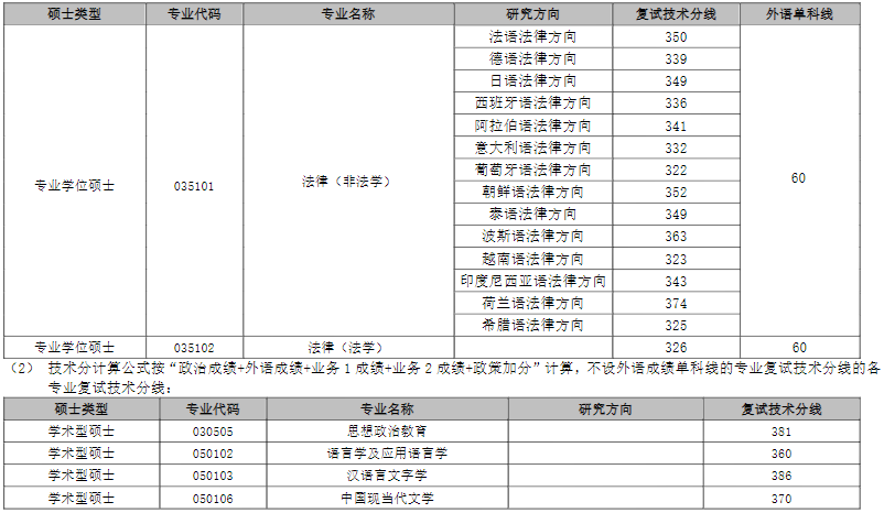 復試分數線我校復試分數線制定辦法:在國家教育部分數線(見教育部網站)基礎上以技術分計。(1)技術分計算公式按“政治成績+外語成績+業務1成績+業務2成績+政策加分”計算,且設外語成績單科線的專業復試技術分線的各專業復試技術分線: