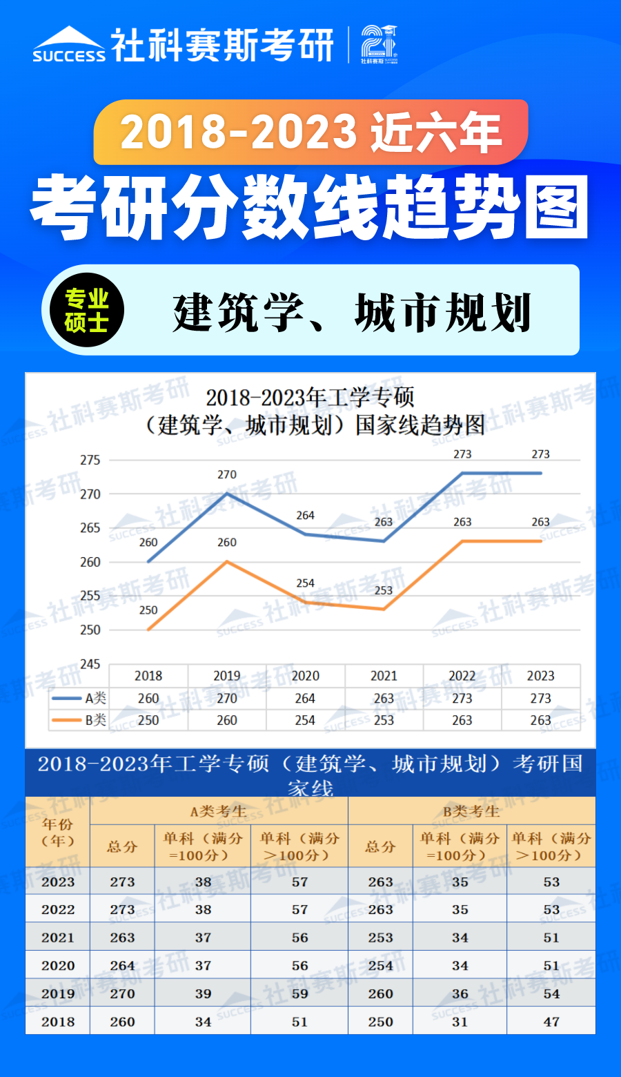 2023考研分?jǐn)?shù)線:2018-2023年工學(xué)專碩(建筑學(xué)、城市規(guī)劃)近六年考研分?jǐn)?shù)線趨勢(shì)圖