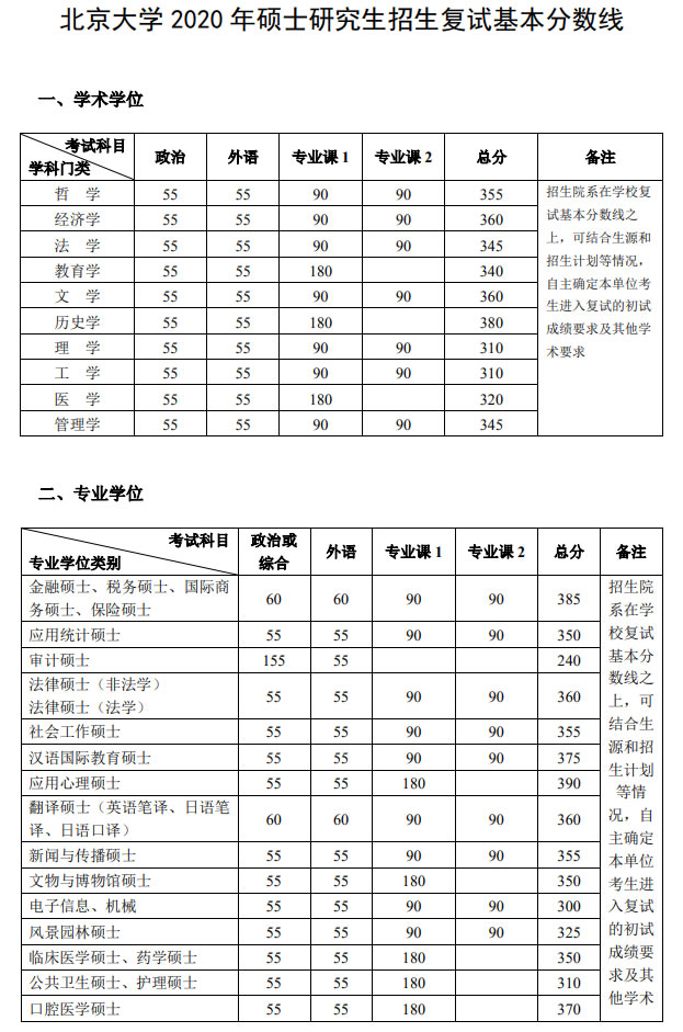 2020考研34所自主劃線分數線:北京大學2020年碩士研究生招生復試基本分數線