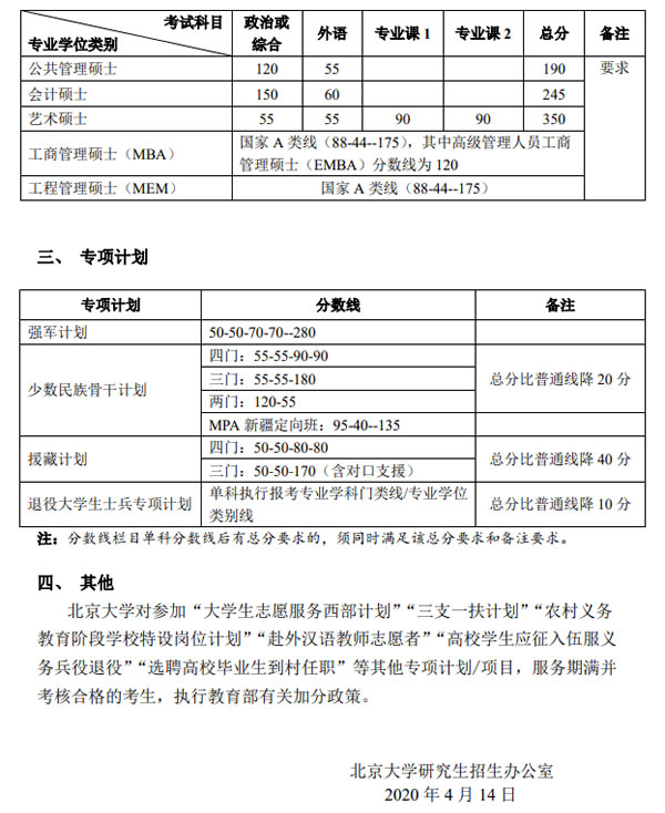 以上就是小編為大家整理“2020考研34所自主劃線分數線:北京大學2020年碩士研究生招生復試基本分數線”的全部內容,想了解更多相關內容,請持續關注本網站。