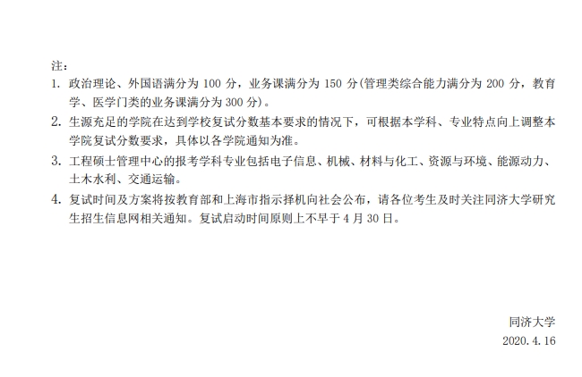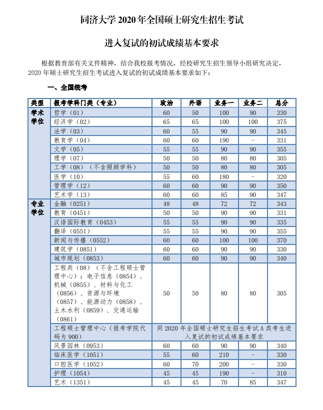 2020考研34所自主劃線分數(shù)線:同濟大學2020年全國碩士研究生招生考試進入復試的初試成績基本要求