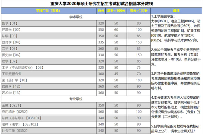 2020考研34所自主劃線分數線:重慶大學2020年全國碩士研究招生考試初試合格基本分數線”,各位考生了解一下~