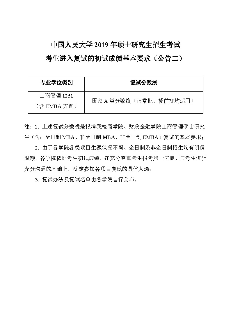 中國人民大學2019年碩士生招生考試進入復試的初試成績基本要求(公告一和二)