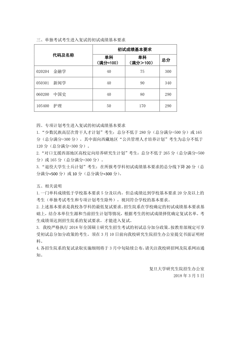 復旦大學2018年碩士研究生招生考試考生進入復試的初試成績基本要求