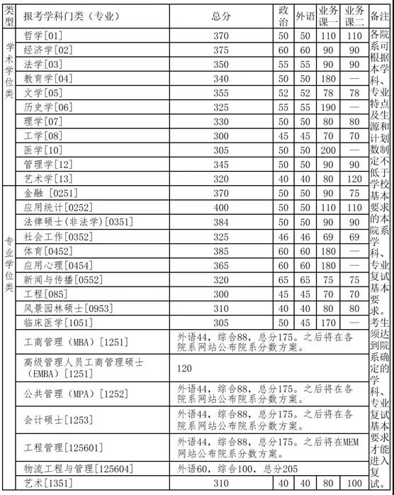 (2)“少數民族高層次骨干人才計劃”(不含新疆MPA項目):同時滿足滿分100分科目單科成績不低于40分;滿分150分科目單科成績不低于70分;滿分200分科目單科成績不低于107分;滿分300分科目單科成績不低于140分;總分滿分300分考生總分不低于195分;總分滿分500分考生中,理工醫考生(報考專業代碼前兩位為“07”、“08”或“10”)要求總分不低于270分,非理工醫考生總分不低于320分。或者依據所報考院系(專業)復試分數線,總分線降10分,單科線不降。兩項分數政策不可同時享受。
