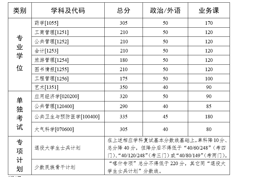 3. 工商管理[1251]、公共管理[1252]、會計[1253]、旅游管理[1254]、 圖書情報[1255]等五個專業(yè)通過提前面試的考生,適用國家 A 類線 (175/44/88)。復(fù)試及錄取要求參見相關(guān)招生單位規(guī)定。