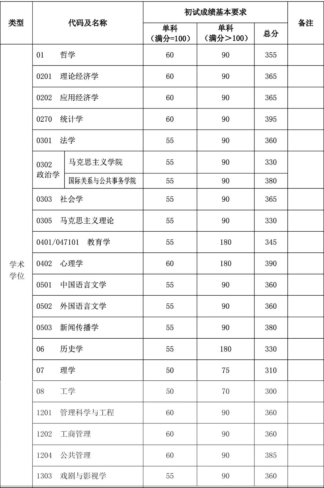 1.“少數民族高層次骨干人才計劃”:總分滿分等于500分的專業,要求考生總分不低于所報考學科初試成績基本要求總分20分;總分滿分等于300分的專業,要求考生總分不低于所報考學科初試成績基本要求總分15分。