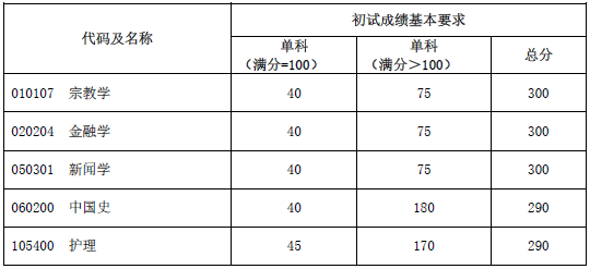3.“退役大學生士兵計劃”:總分滿分等于500分的專業,要求考生總分不低于所報考學科初試成績基本要求總分的10分;總分滿分等于300分的專業,要求考生總分不低于所報考學科初試成績基本要求總分的5分。