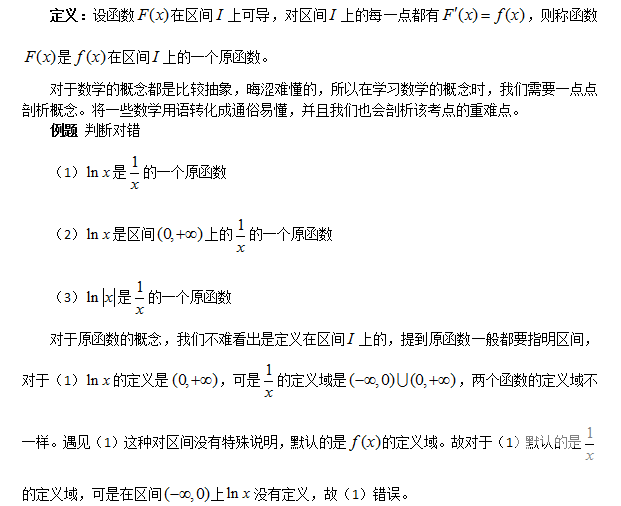 對(duì)于不定積分的定義是在原函數(shù)的定義上定義的,所以清楚的原函數(shù)的定義,會(huì)對(duì)后面學(xué)習(xí)不定積分的時(shí)候有很大的幫助。
