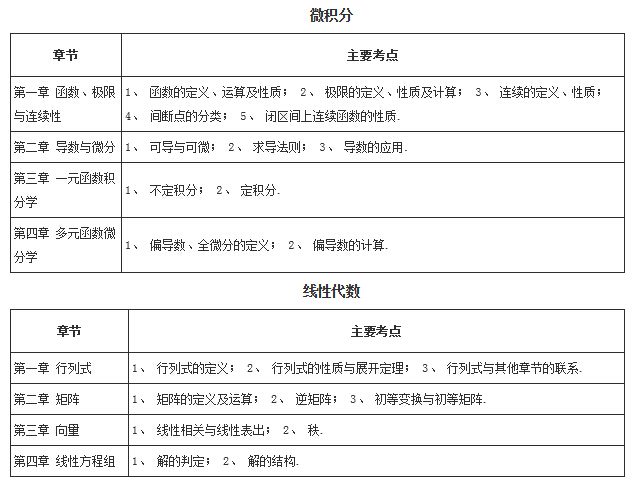 考試大綱比較簡略,只給出了考試的大致范圍,沒有完全限定考試內容。考試中會出現一些大綱中沒有指出,但在整個邏輯體系內的考點。如函數、極限與連續性;行列式;向量的線性表出等。這就要求考生在復習的時候,不拘泥于考試大綱,建立清晰完整的知識體系,體會考試大綱的內在要求。接下來,我們將經濟類聯考數學部分的主要考點歸納總結如下: