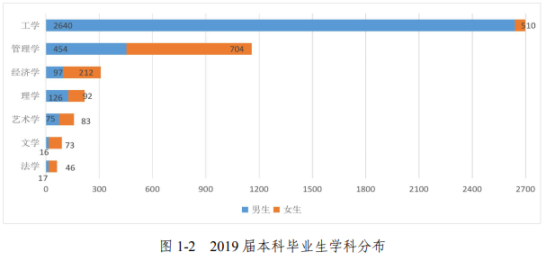 2019 屆本科畢業(yè)生分布在 7 大學(xué)科,如圖 1-2,本科畢業(yè)生人數(shù)排名前三的學(xué)科分別是: 工學(xué) 3150 人,占比 61.22%,是本校的主要學(xué)科大類,其次是管理學(xué) 1158 人和