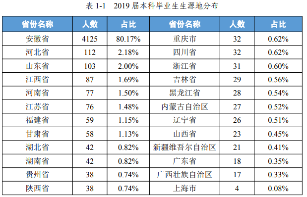 2019 屆學(xué)校共有本科畢業(yè)生 5145 人,分布如圖 1-1。其中男生 3425人,女生 1720 人,男女生比例約 2:1。民族來源主要是漢族(5051 人,占比 98.17%),安徽省內(nèi)生源本科畢業(yè)生 4125 人。政治面貌為中共黨員(含預(yù)備黨員)832 人,占全部本科畢業(yè)生的 16.17%。
