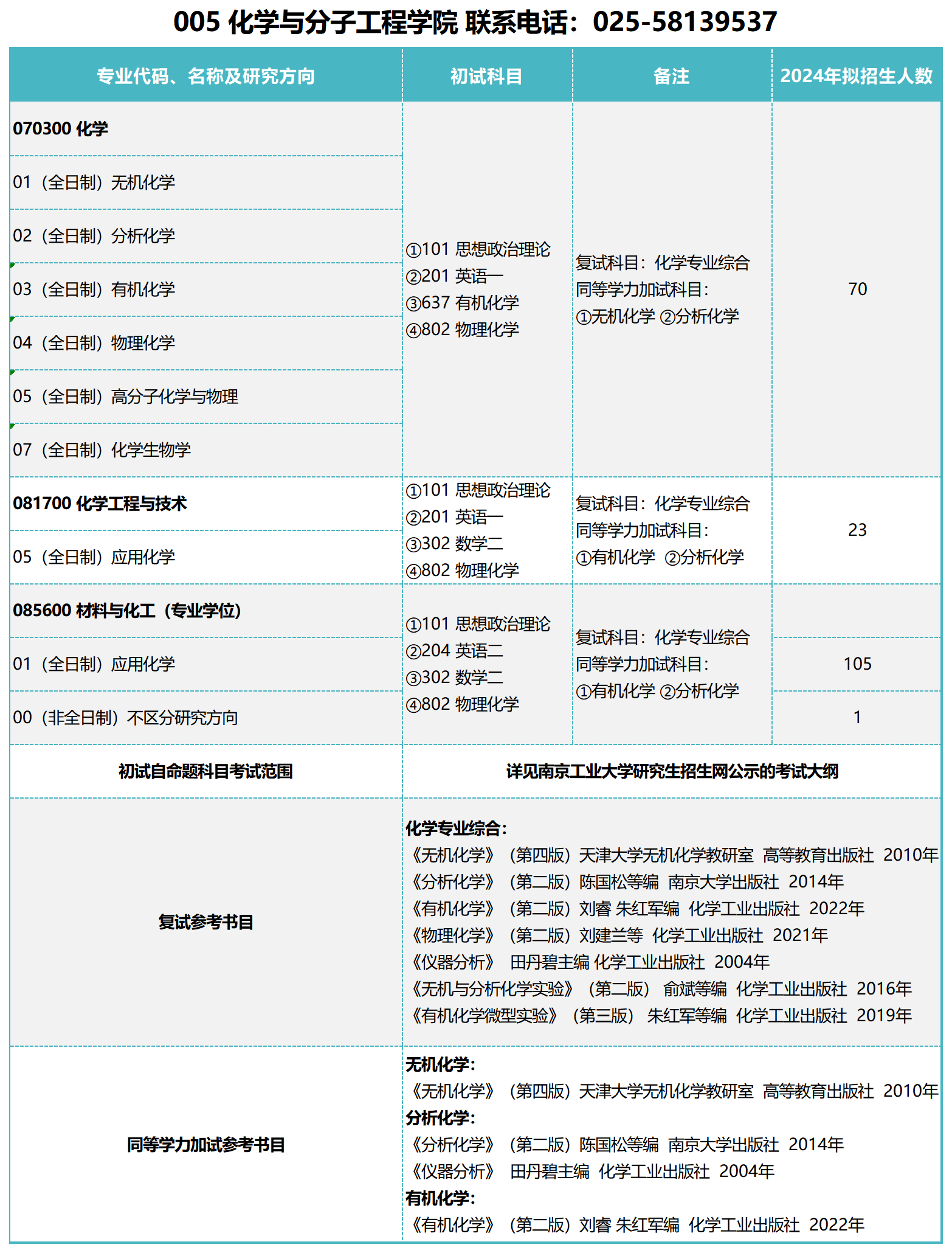 以上就是“2024考研參考書目:南京工業大學化學與分子工程學院2024年碩士研究生招生參考書目”的內容,更多考研信息,請持續關注本網站。