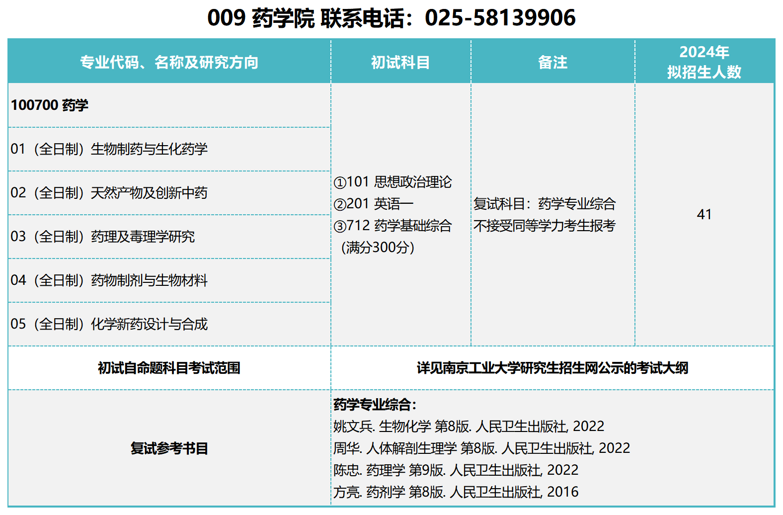 以上就是“2024考研參考書目:南京工業大學藥學院2024年碩士研究生招生參考書目”的內容,更多考研信息,請持續關注本網站。