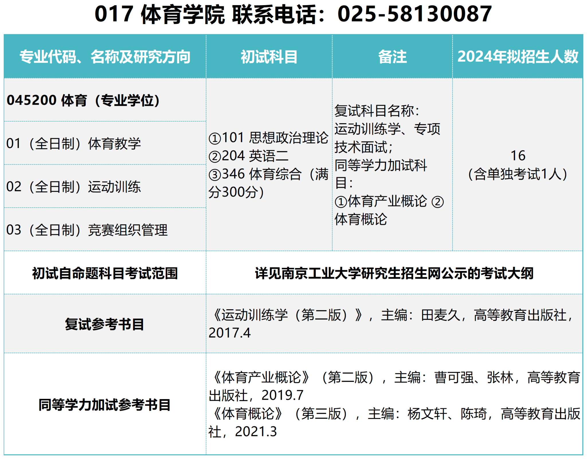 以上就是“2024考研參考書目:南京工業大學體育學院2024年碩士研究生招生參考書目”的內容,更多考研信息,請持續關注本網站。