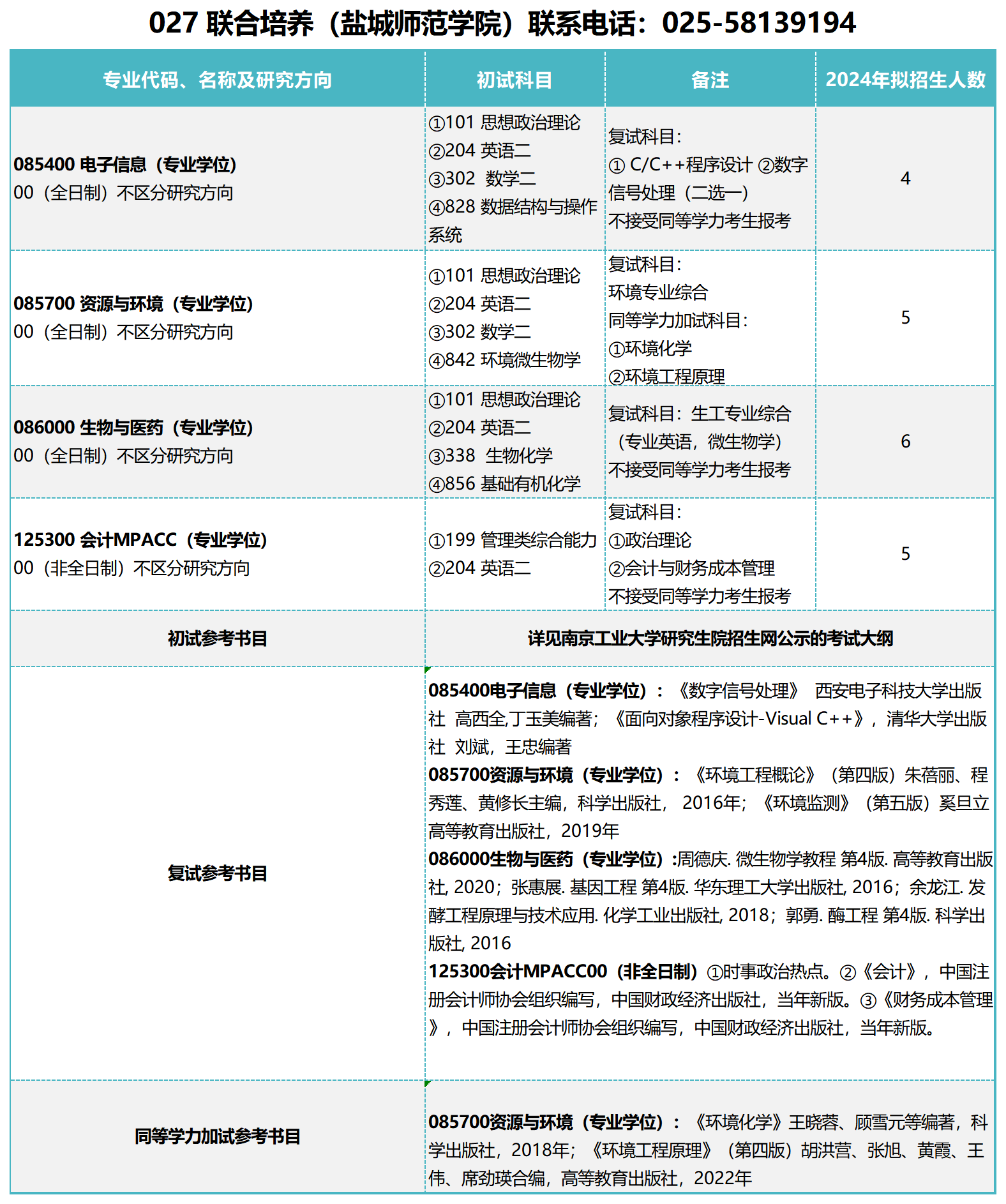 以上就是“2024考研參考書目:南京工業(yè)大學(xué)聯(lián)合培養(yǎng)(鹽城師范學(xué)院)2024年碩士研究生招生參考書目”的內(nèi)容,更多考研信息,請(qǐng)持續(xù)關(guān)注本網(wǎng)站。