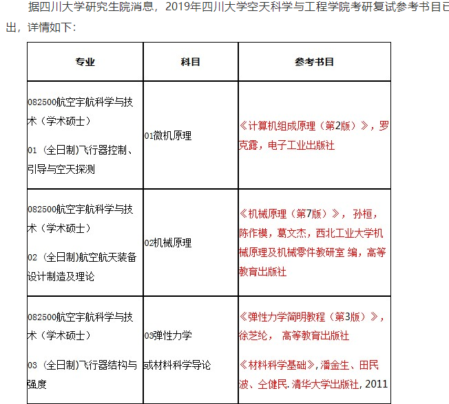 四川大學(xué)空天科學(xué)與工程學(xué)院2019研究生復(fù)試參考書(shū)目