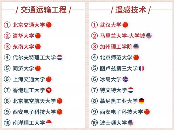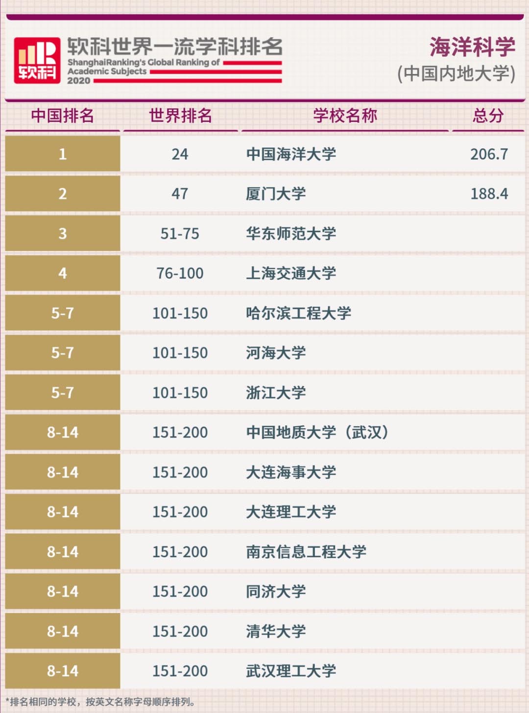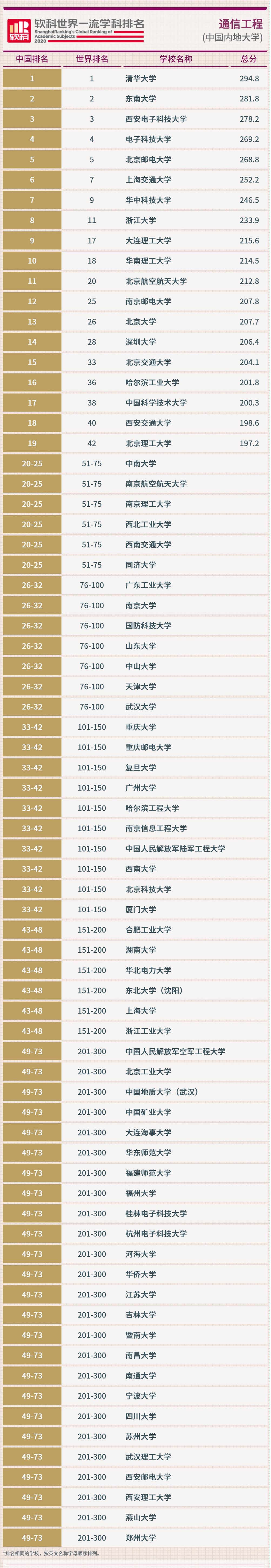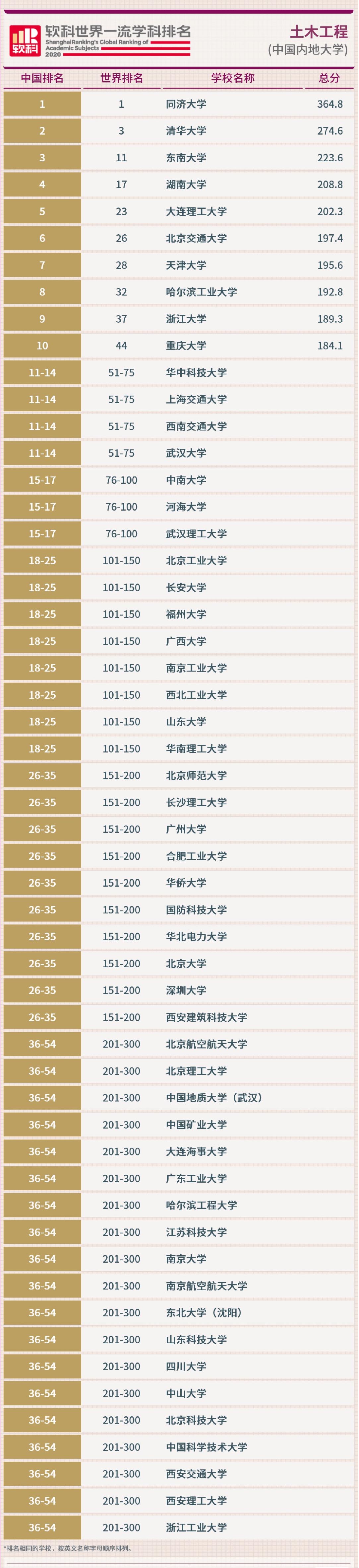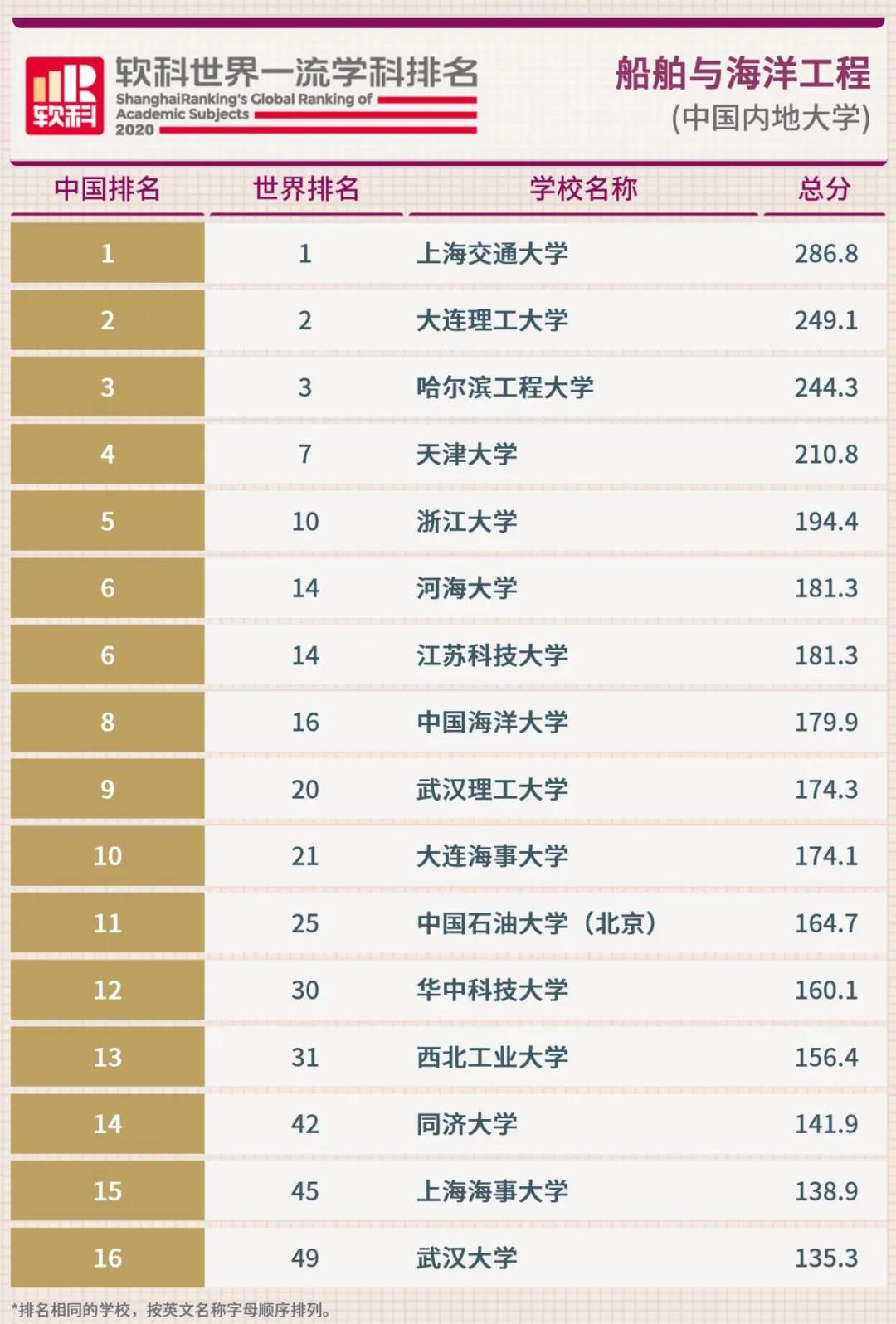 2020軟科世界一流學科排名中,中國內地高校表現強勁,在10個學科奪得世界第一,分別是清華大學(通信工程)、哈爾濱工業大學(儀器科學)、同濟大學(土木工程)、上海交通大學(船舶與海洋工程)、武漢大學(遙感技術)、北京科技大學(冶金工程)、北京航空航天大學(航空航天工程)、北京交通大學(交通運輸工程)、江南大學(食品科學與工程)和中南大學(礦業工程)。