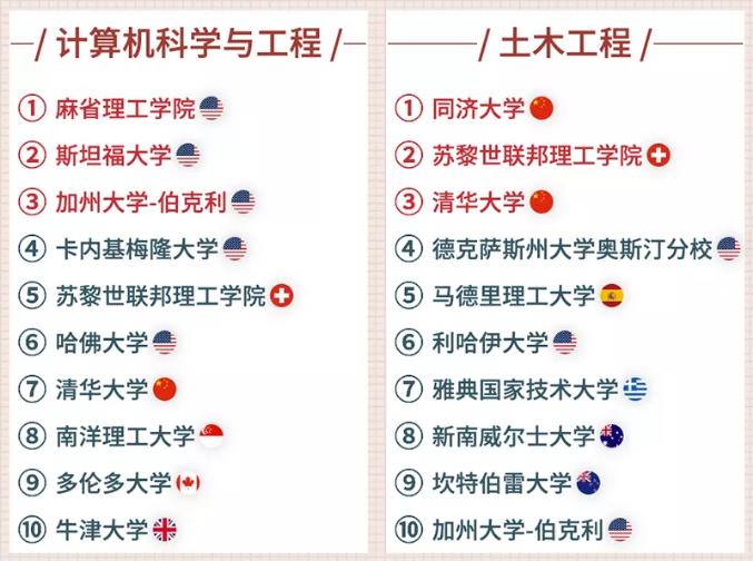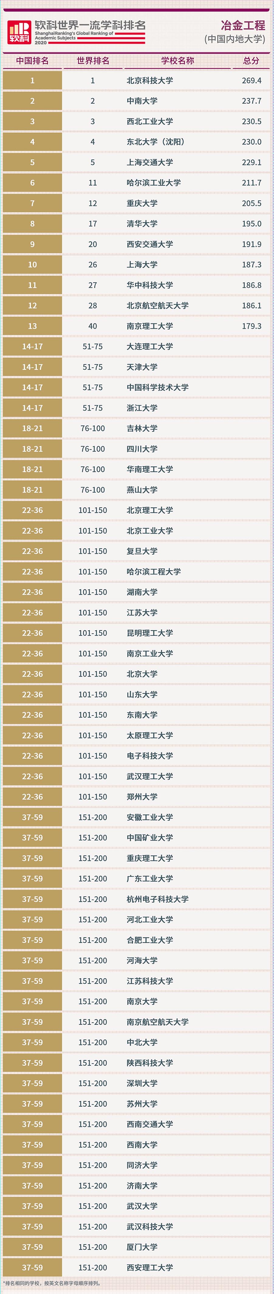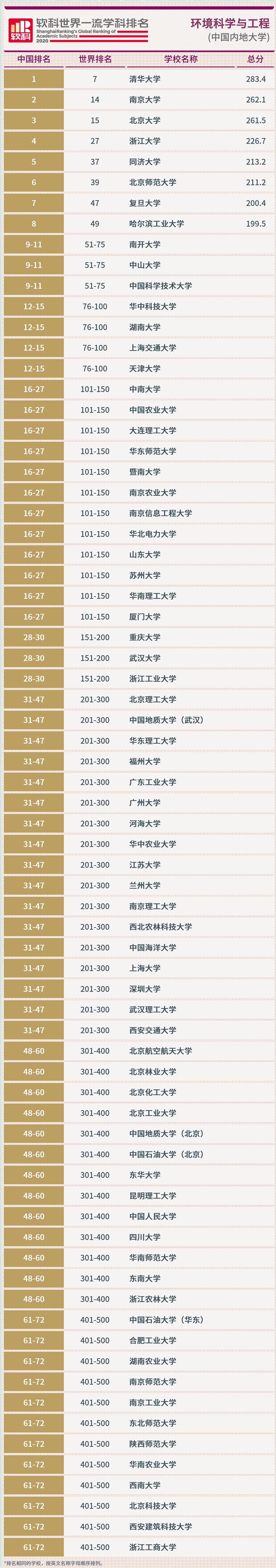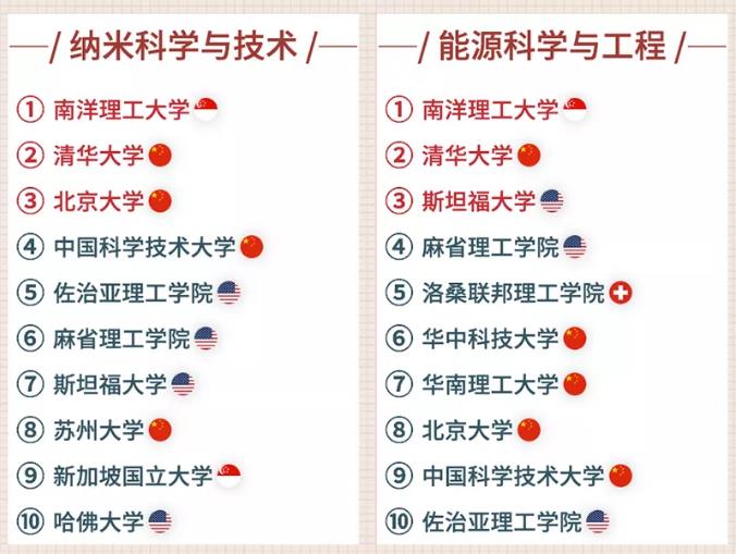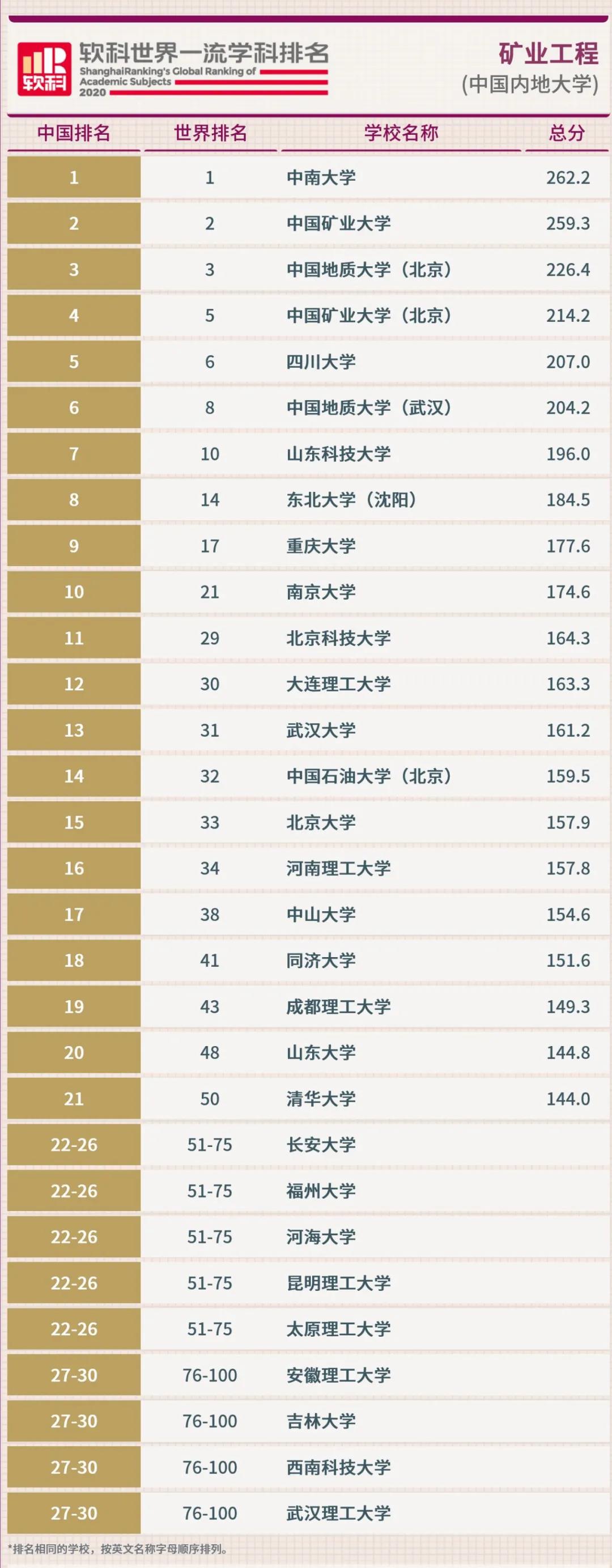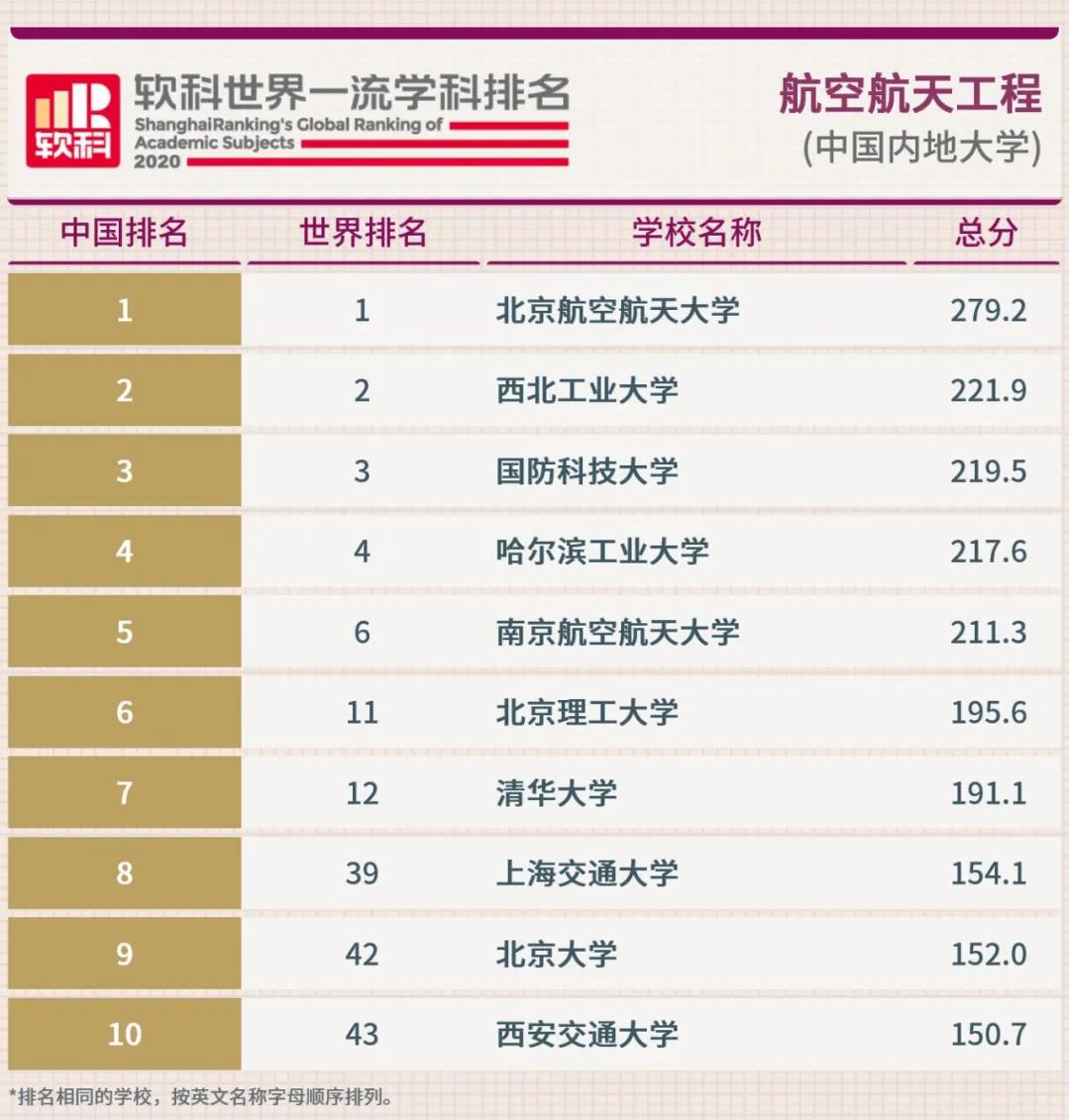 2020軟科世界一流學科排名中,中國內地高校表現強勁,在10個學科奪得世界第一,分別是清華大學(通信工程)、哈爾濱工業大學(儀器科學)、同濟大學(土木工程)、上海交通大學(船舶與海洋工程)、武漢大學(遙感技術)、北京科技大學(冶金工程)、北京航空航天大學(航空航天工程)、北京交通大學(交通運輸工程)、江南大學(食品科學與工程)和中南大學(礦業工程)。