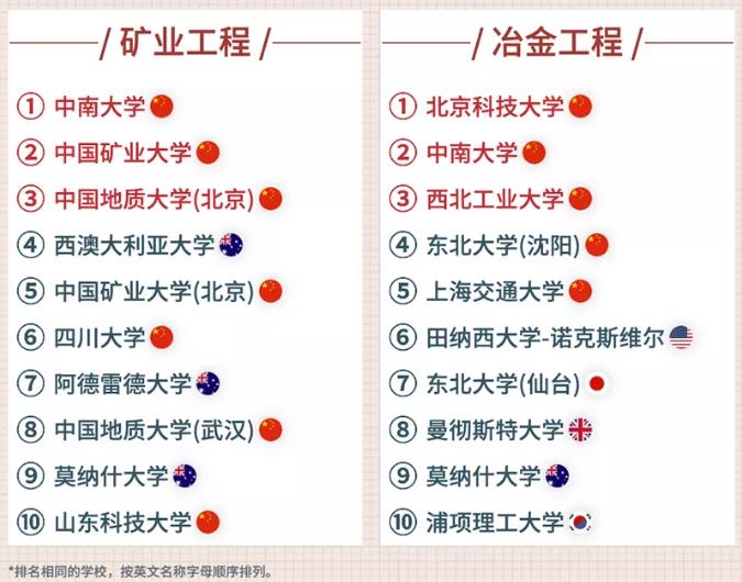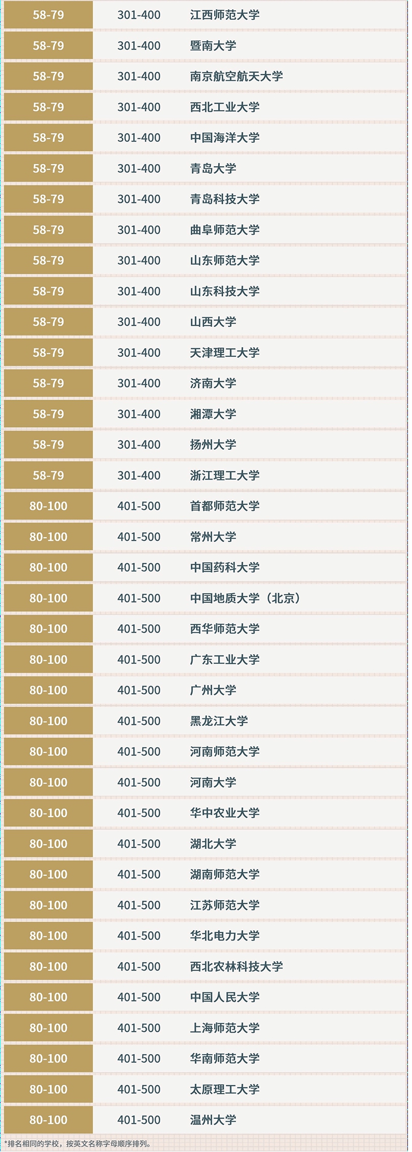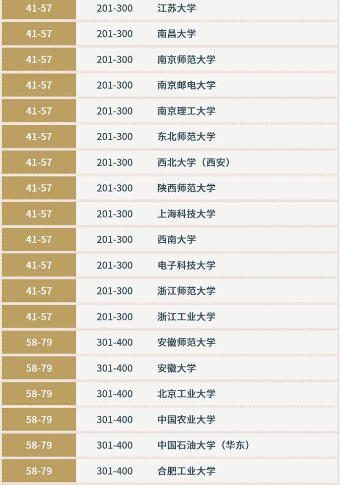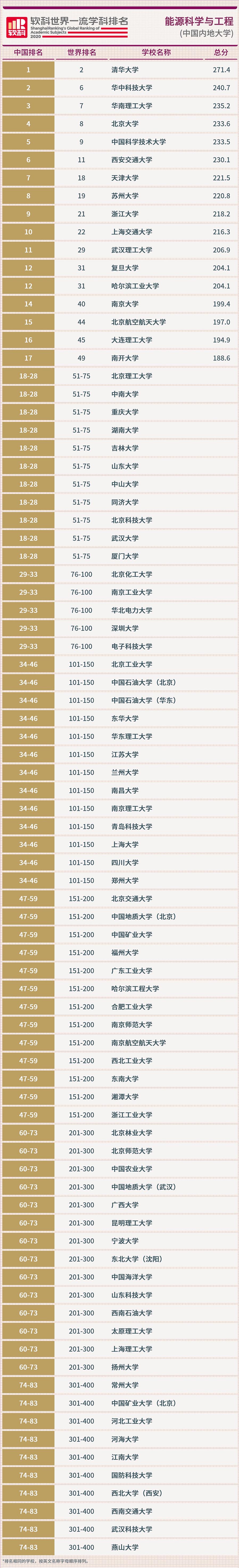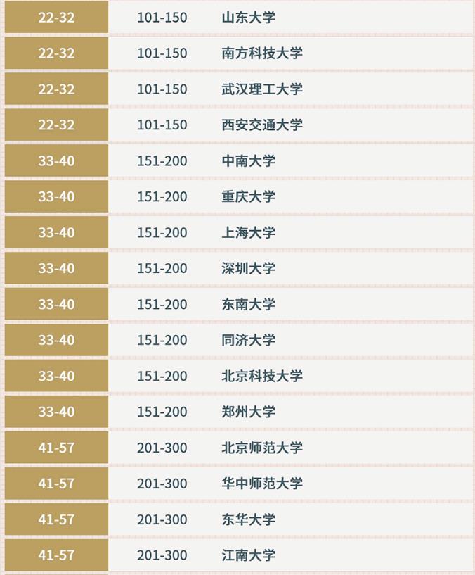 中國內地高校在工學領域表現強勢,在18個工學學科的世界五十強中,中國內地高校的數量超過10所,分別是儀器科學(25所)、化學工程(21所)、交通運輸工程(21所)、礦業工程(21所)、納米科學與技術(20所)、通信工程(19所)、能源科學與工程(17所)、材料科學與工程(16所),船舶與海洋工程(16所)、生物醫學工程(14所)、遙感技術(14所)、機械工程(13所)、冶金工程(13所)、計算機科學與工程(12所)、控制科學與工程(11所)、食品科學與工程(11所)、土木工程(10所)和航空航天工程(10所)。