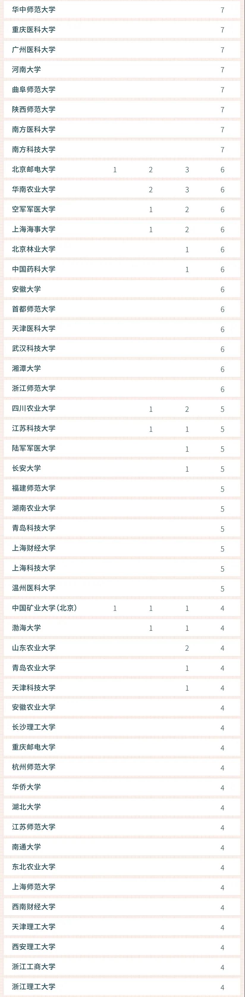 從中國內地高校的上榜學科數量來看,北京大學最多,共計47個學科上榜。中山大學、浙江大學、清華大學和武漢大學分別以45次、44次、43次和42次上榜數分列前五。此外,北京大學有32個學科位列世界百強,也是中國內地高校中百強學科數量最多的高校。值得一提的是,清華大學有13個學科躋身世界前十,是中國內地高校中前十名學科最多的高校,上海交通大學和浙江大學也分別有7個和6個學科位列世界前十。