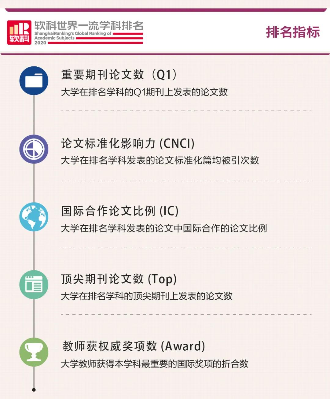 “軟科世界一流學科排名”使用一系列國際可比的客觀學術指標對全球大學在相關學科的表現進行測量,包括學科國際權威獎項、學科頂尖成果、科研質量、國際合作等。2020年,軟科對評價體系進行了優化,使用“重要期刊論文數(Q1)”代替原“論文總數(PUB)”,用于測量被評價大學在相應學科的高水平科研產出。
