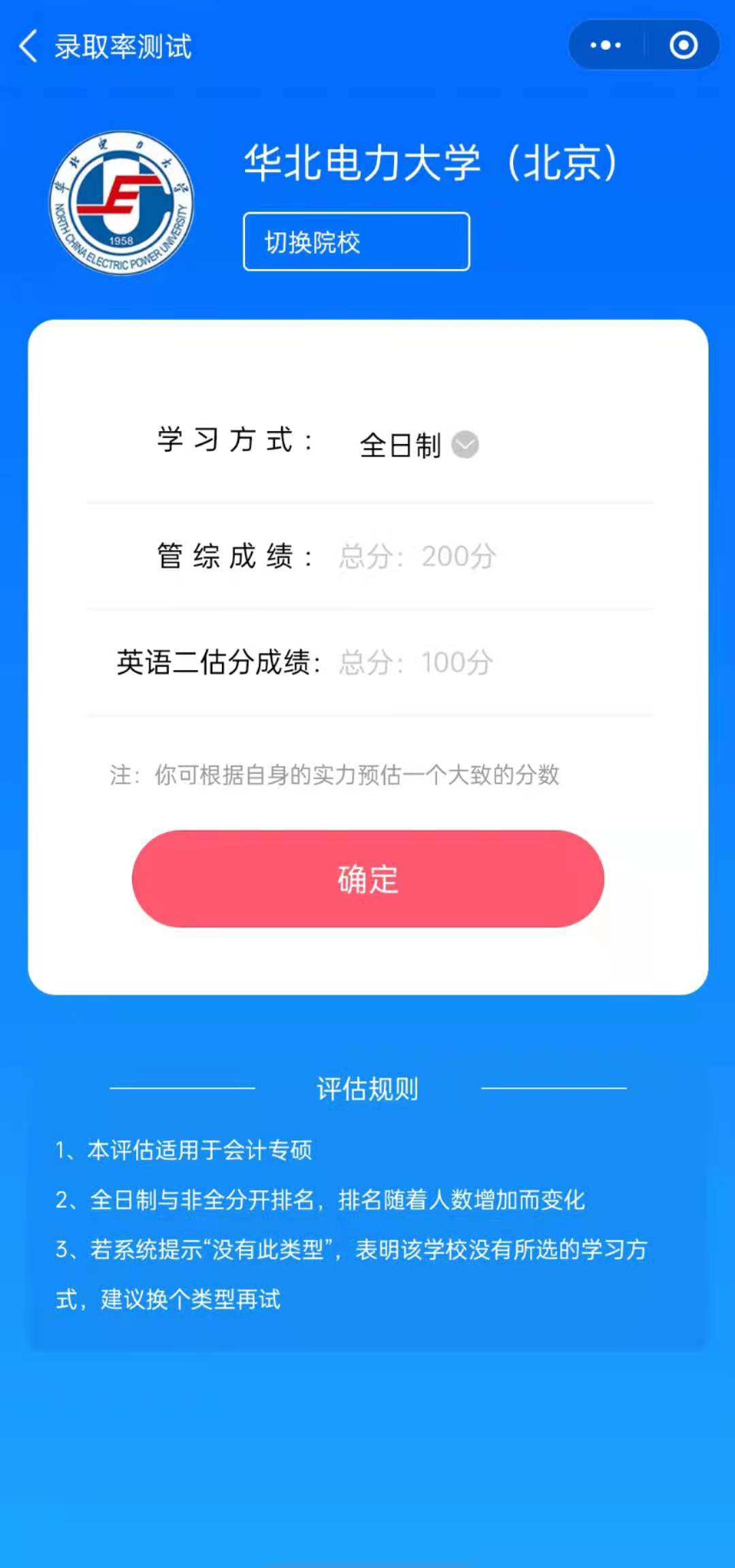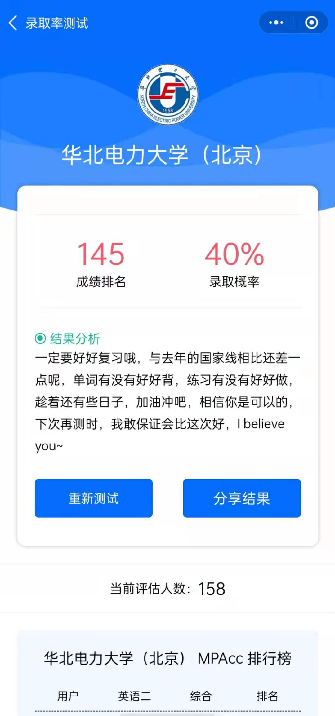 考生選好心儀的院校后,可以根據(jù)自己的復(fù)習(xí)情況輸入預(yù)估的管綜成績、英語成績進行錄取率測試。測試結(jié)果中提供成績排名、錄取概率以及結(jié)果分析,還可以根據(jù)其他用戶的錄取率情況查看自己的排名。