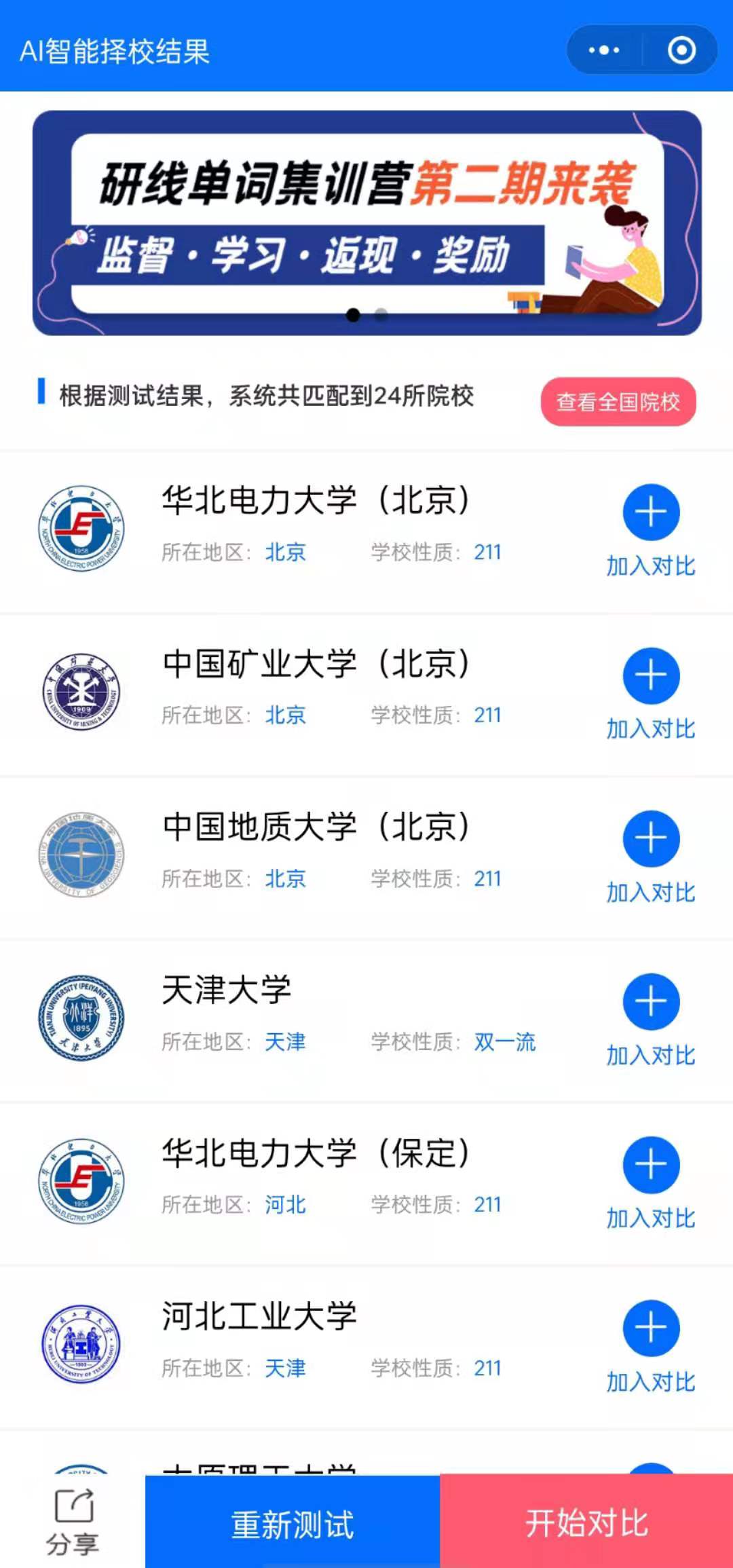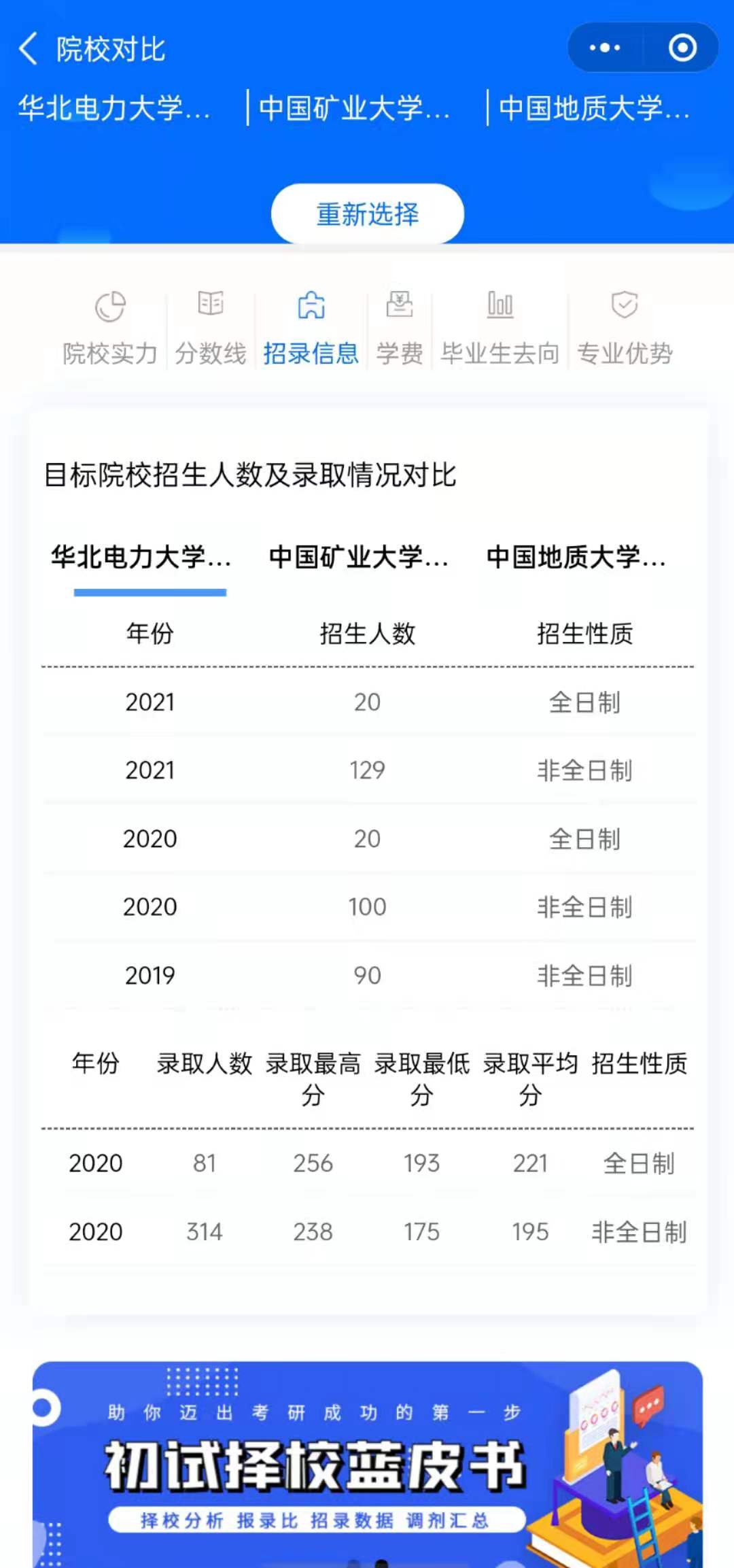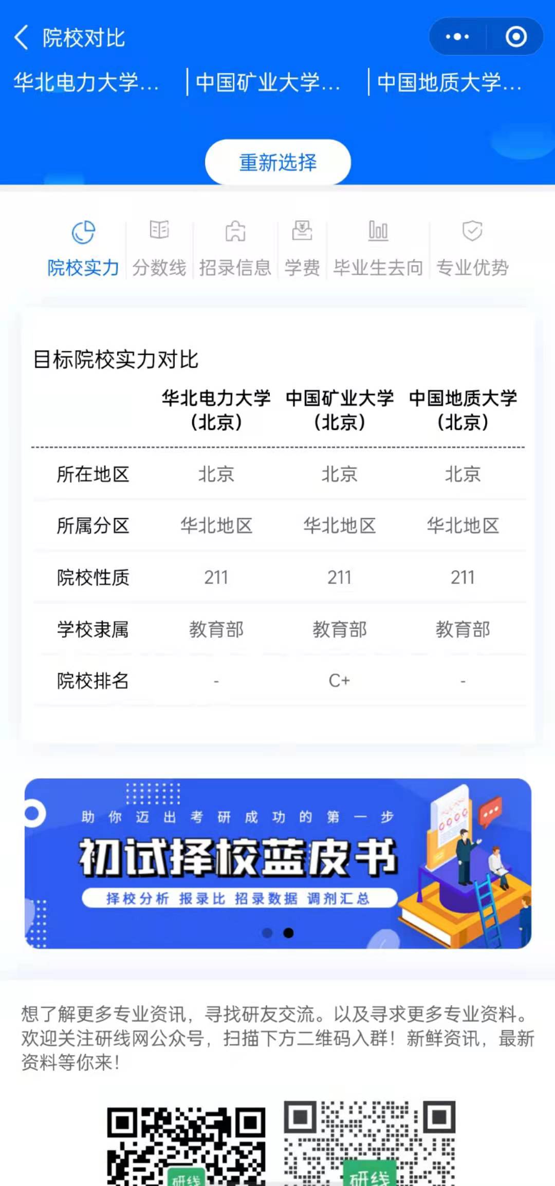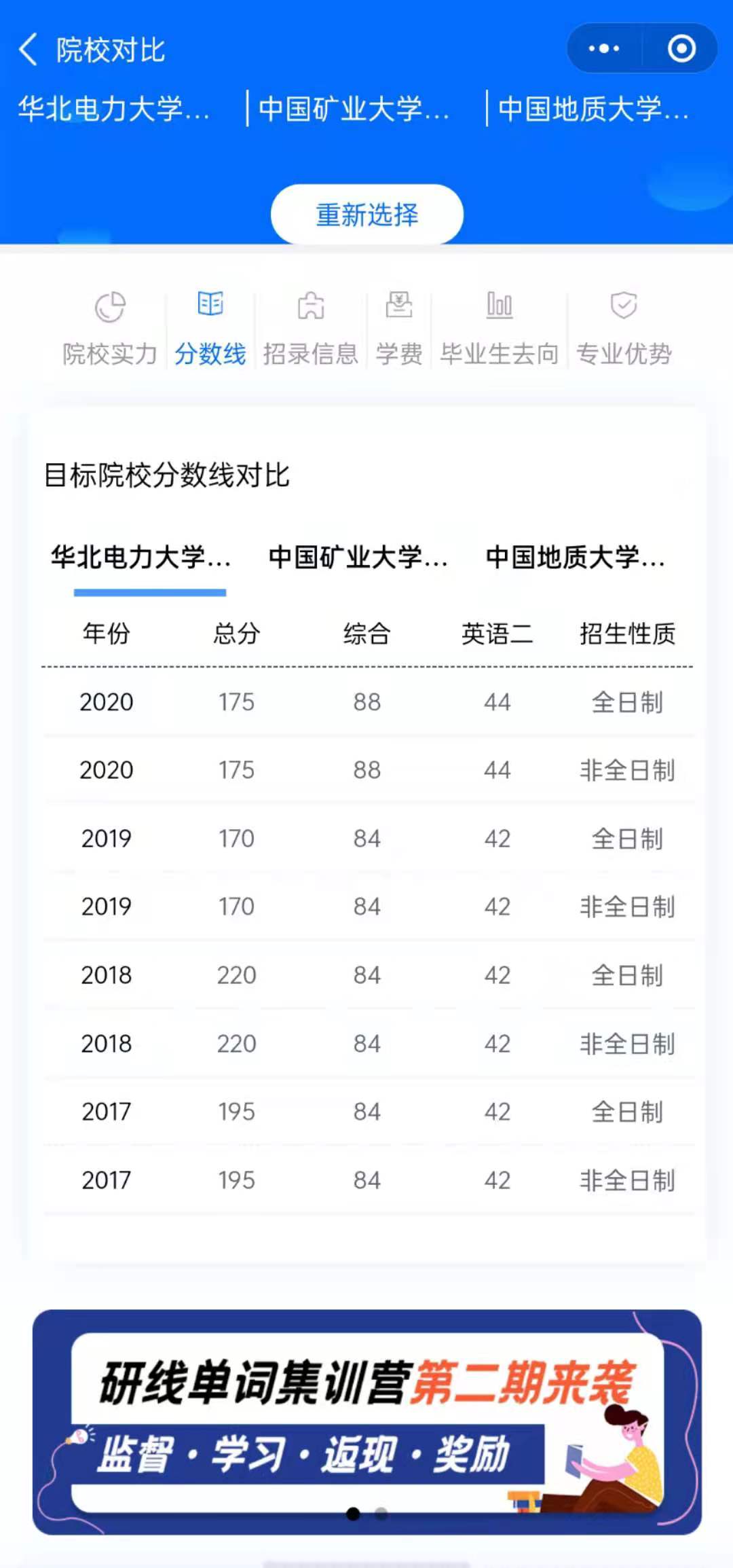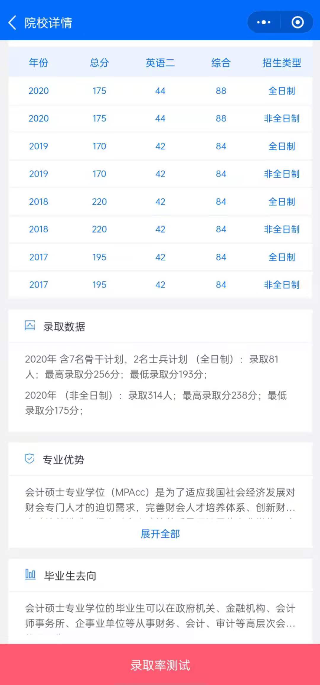 MPAcc考研助手還提供院校對比功能,將心儀院校加入對比,小程序會直觀的提供對比院校的詳細對比數(shù)據(jù),包括:院校實力、分數(shù)線、招錄信息、學(xué)費、畢業(yè)生去向、專業(yè)優(yōu)勢,幫助考生進一步精準擇校。