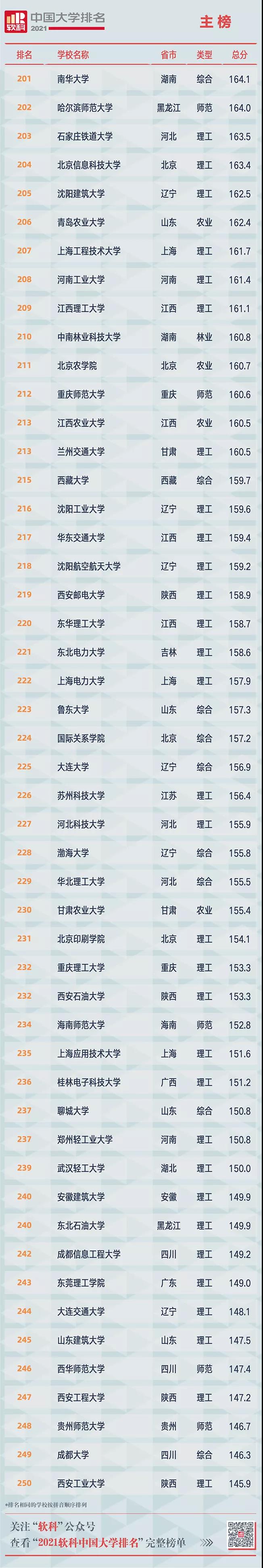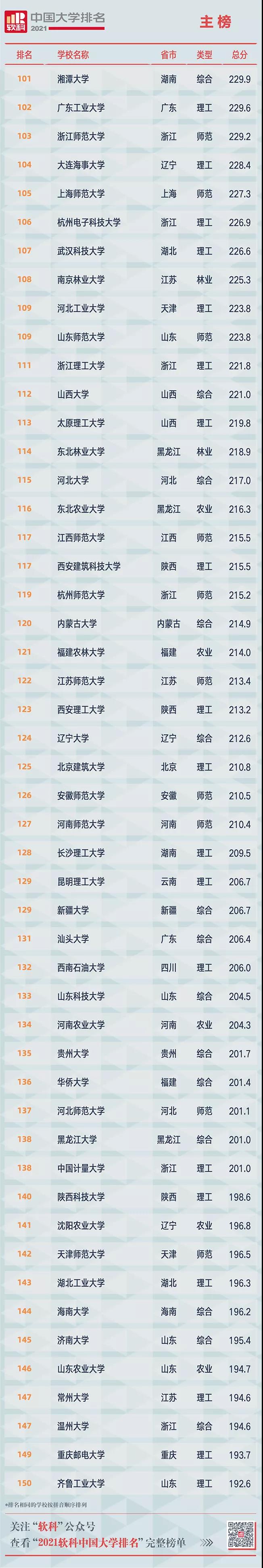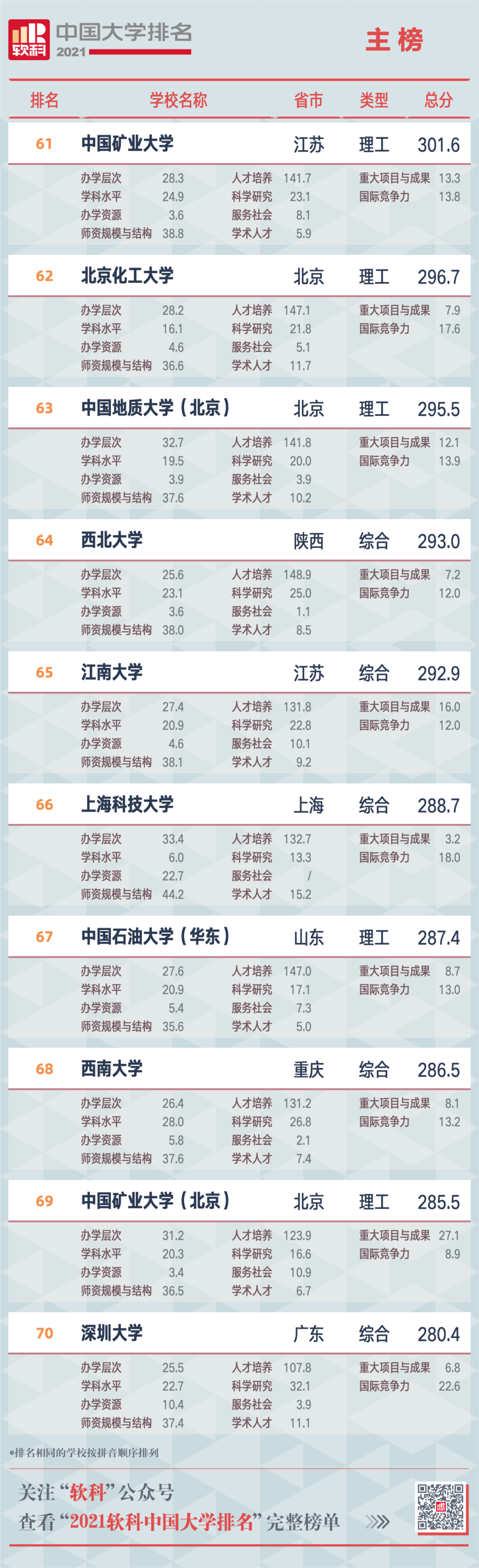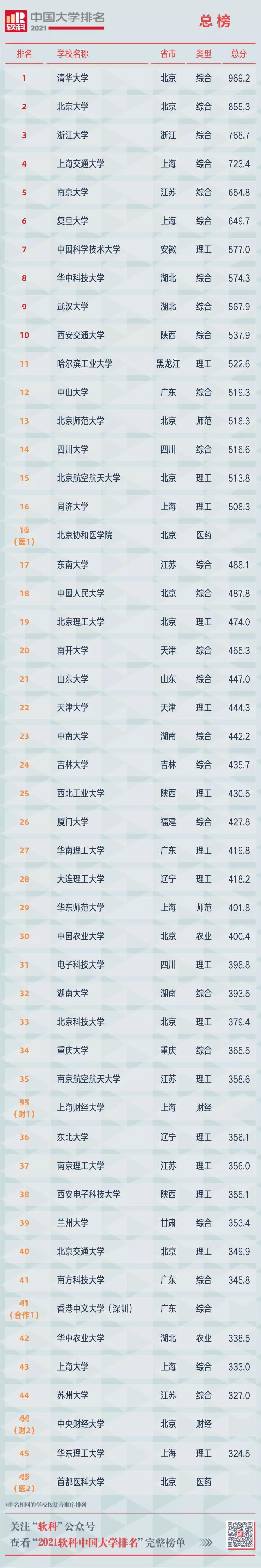 2021軟科中國大學排名(主榜)的上榜高校共有582所,清華大學、北京大學、浙江大學占據(jù)前三,上海交通大學、南京大學位列全國前五。其他位列全國前十名的大學依次為復旦大學(第六)、中國科學技術大學(第七)、華中科技大學(第八)、武漢大學(第九)、西安交通大學(第十)。西安交通大學相較2020年排名上升1名,首次入圍全國十強。西安交通大學堅持“扎根西部、服務國家、世界一流”的辦學定位,建設世界一流研究型大學的愿景已現(xiàn)曙光。
