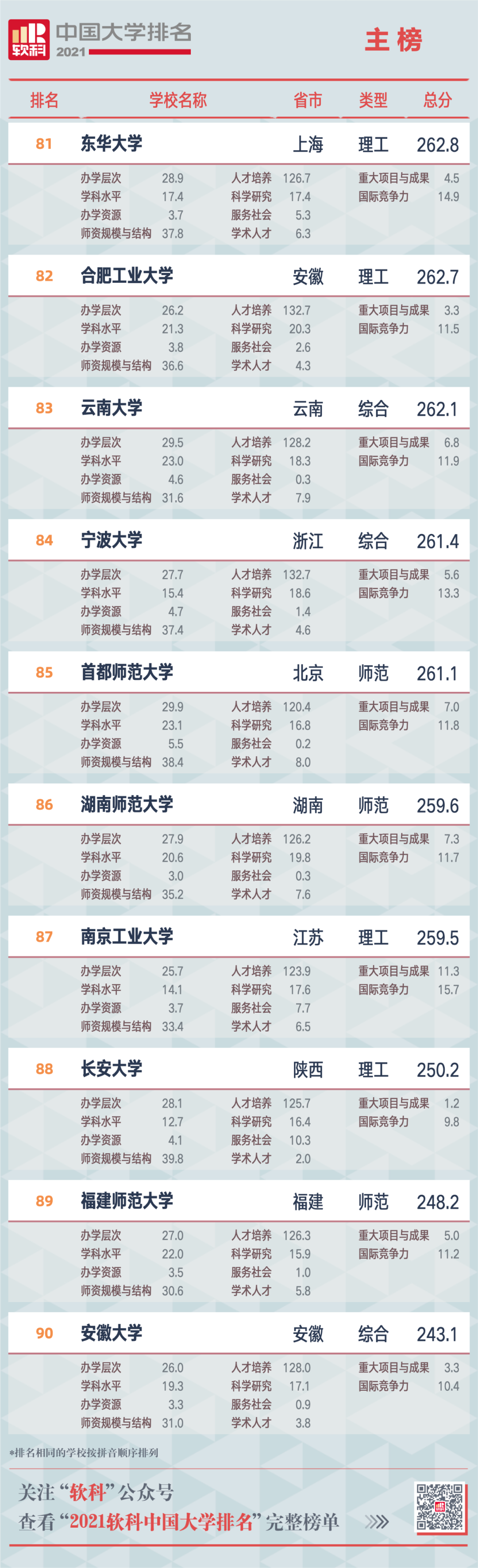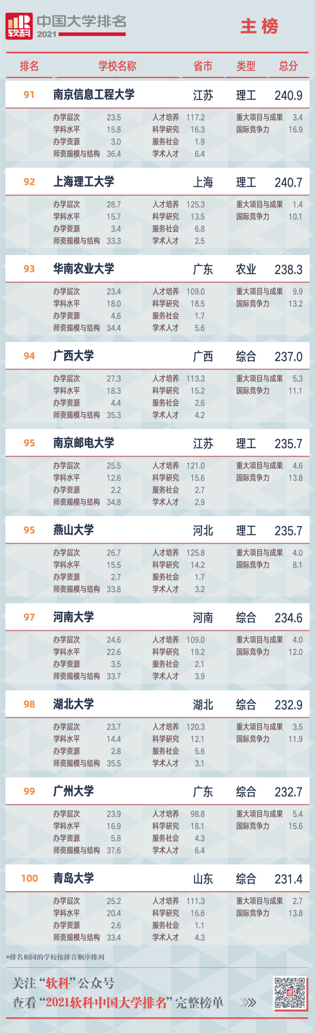 “雙一流”高校在排名中占絕對優(yōu)勢地位,百強高校中有86所為“雙一流”高校,其中廣西大學排名較2020年上升7名,躋身全國百強,位列全國第94,至此“雙一流”高校在百強榜單再增一席。