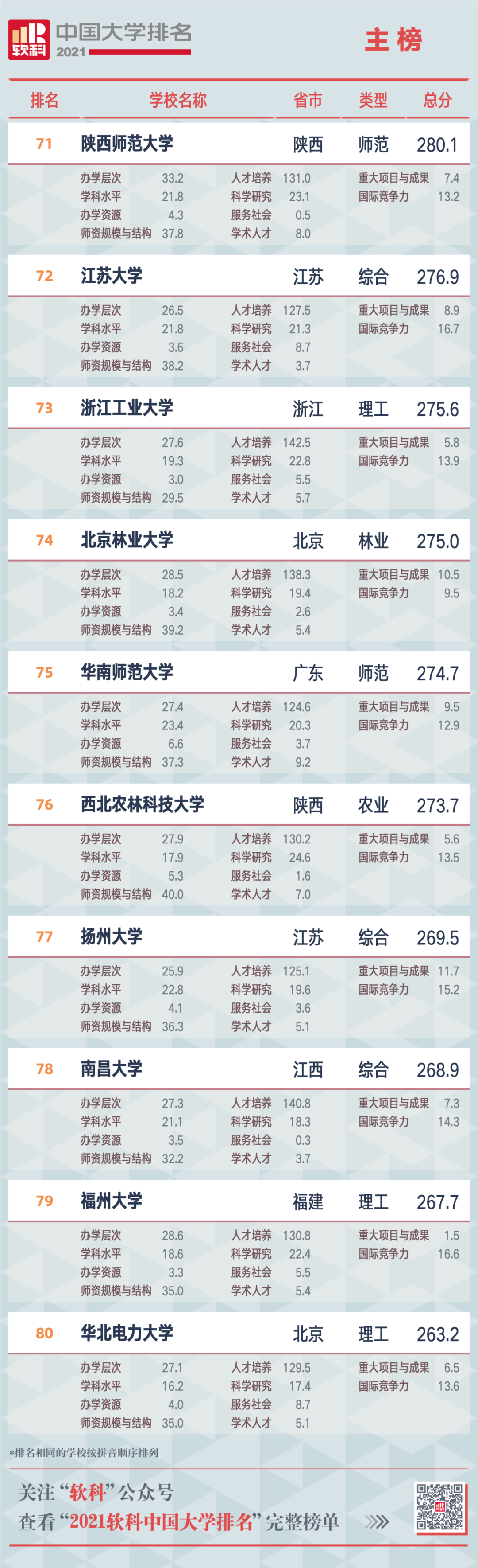 為響應新時期國家對高等教育改革發(fā)展和教育評價的要求,構建符合中國實際、具有世界水平的評價體系,在深入學習國家有關政策、積極聽取專家建議并充分研究和討論的基礎上,軟科對中國大學排名的指標體系進行了優(yōu)化和創(chuàng)新:第一,堅持正確導向,推進落實立德樹人根本任務。2021軟科中國大學排名在“人才培養(yǎng)”模塊新增了“立德樹人典型”和“思想政治教育”兩個維度,以“立德樹人典型”反映高校在師德師風建設和學生德育方面的成果,以“思想政治教育”展示高校在貫徹立德樹人根本任務中的能力和成績;第二,以增值評價為起點,積極探索高校人才培養(yǎng)發(fā)展性評價。增值評價體現(xiàn)了“以學生發(fā)展為本”的重要思想,2021年排名在“培養(yǎng)結果”維度下增加了“本科生增值”指標,首次將增值評價的理念在中國大學評價中具體實施;第三,克服人才評價“唯帽子”,把實際貢獻作為人才標準。2021年排名的“學術人才”模塊下,各個類別的人才統(tǒng)計都不再局限于人才計劃的入選者,而是把重大項目的承擔者、重大成果的完成人等做出重大貢獻的專家學者同樣納入人才統(tǒng)計。此外,今年排名還增設了“文科學術骨干”維度,統(tǒng)計人文社科領域的杰出人才數(shù)量;第四,回應專家和學校建議,豐富擴充評價指標。2021年軟科中國大學排名將反饋意見比較集中的教學基地、科研平臺、重點教材、專利獲獎等大學常規(guī)監(jiān)測指標首次納入排名指標體系,進一步提升評價體系與大學發(fā)展的契合度。