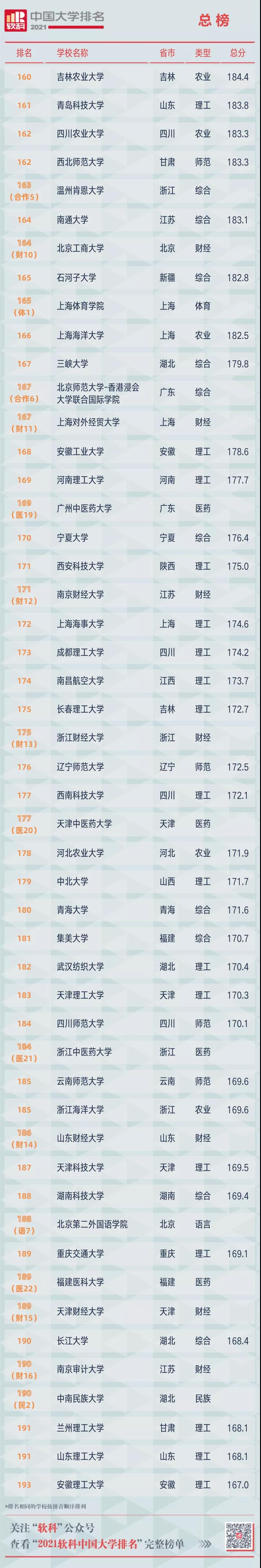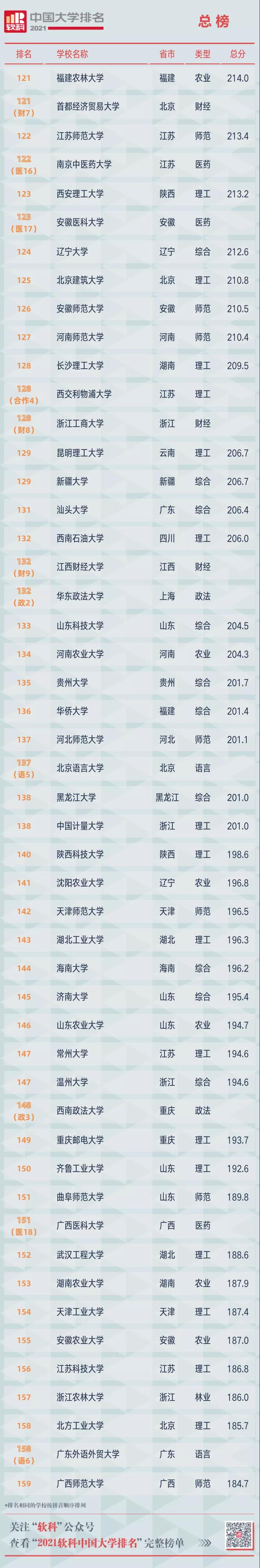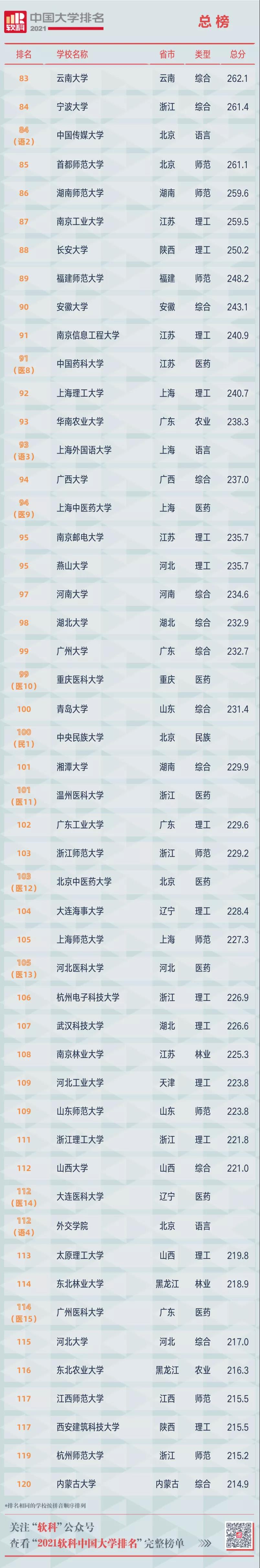 下表為綜合性大學排名、6個單科性大學和合作辦學大學的全國參考排名總榜單。