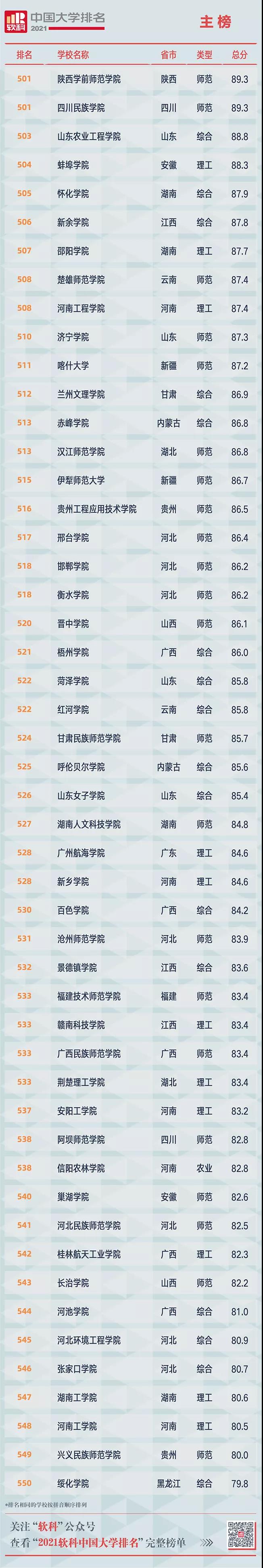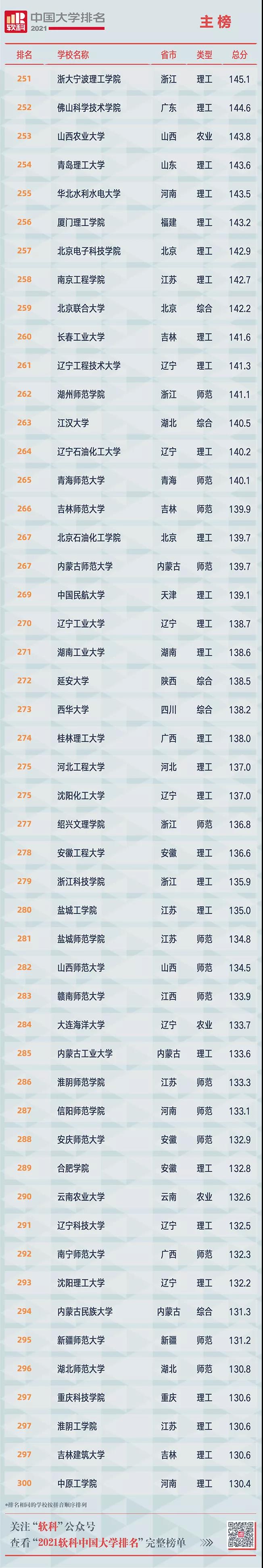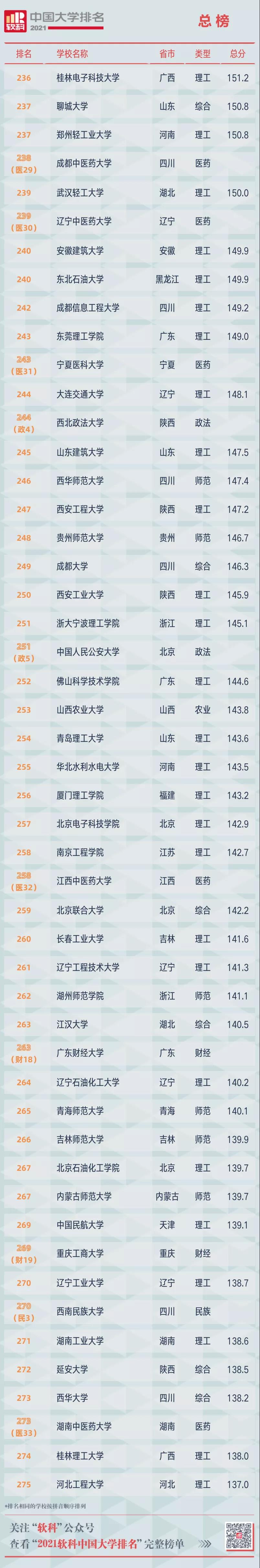 下表為綜合性大學排名、6個單科性大學和合作辦學大學的全國參考排名總榜單。