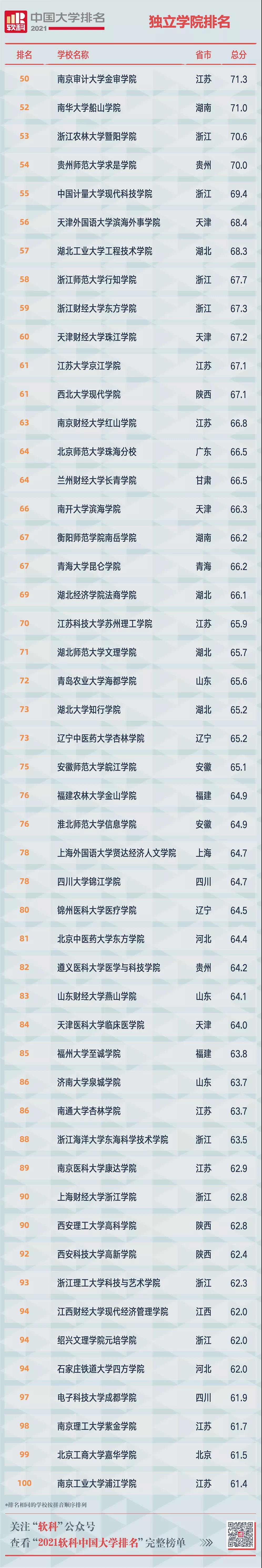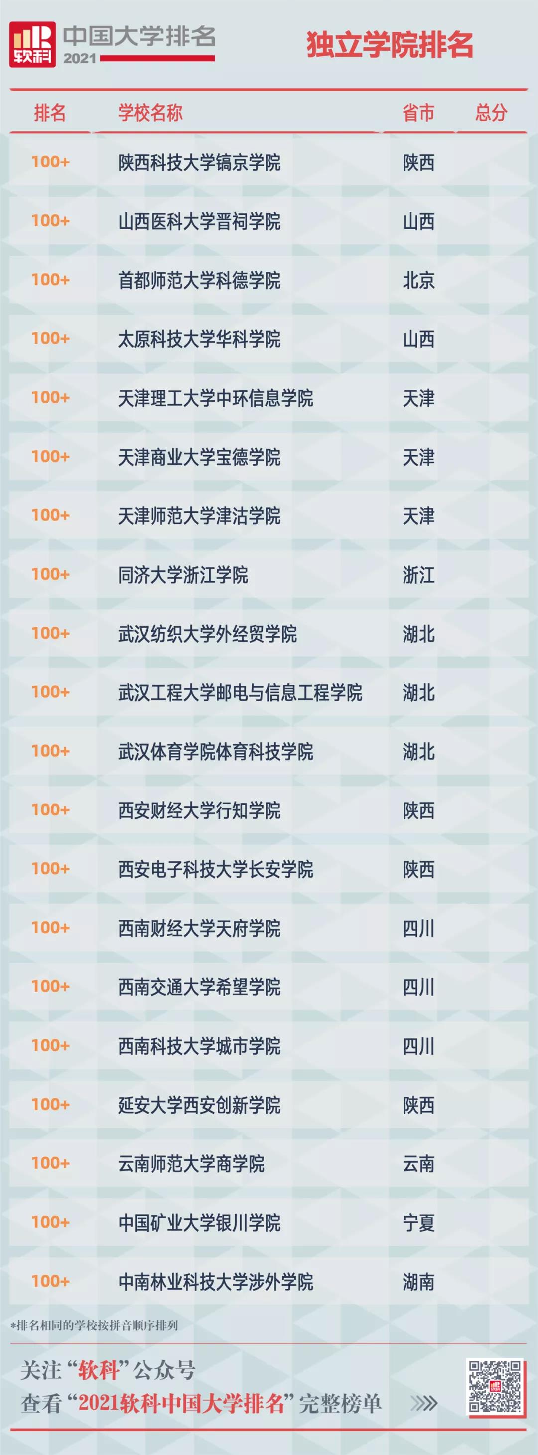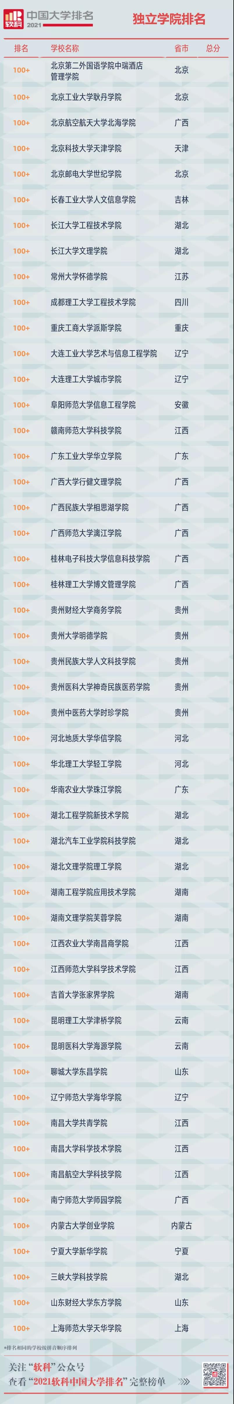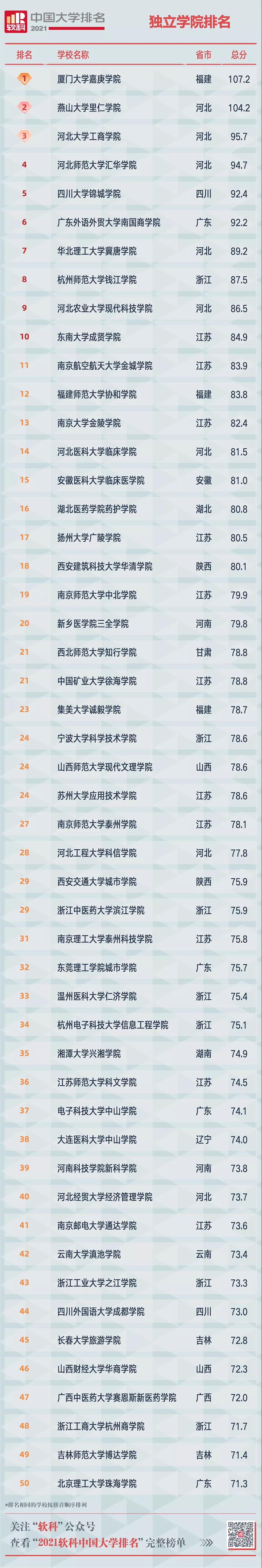 2021軟科中國獨立學院排名上榜高校共170所,廈門大學嘉庚學院、燕山大學里仁學院、河北大學工商學院居全國前三。