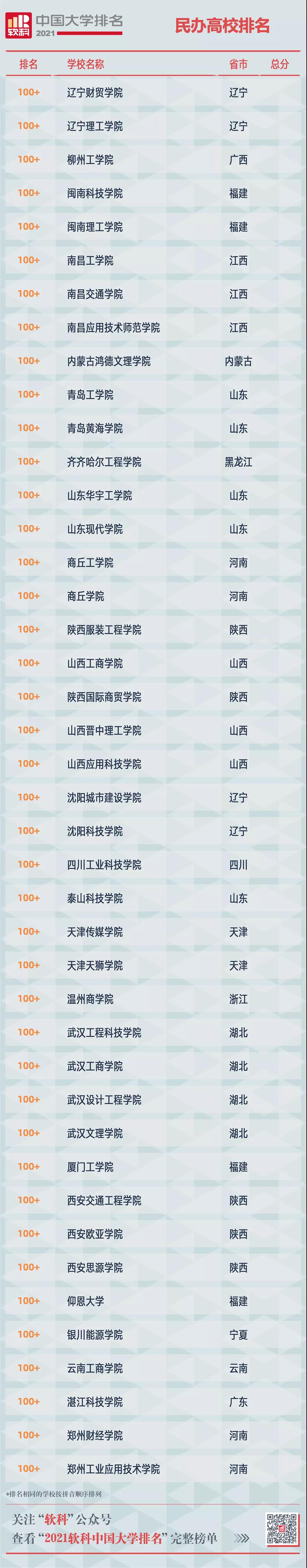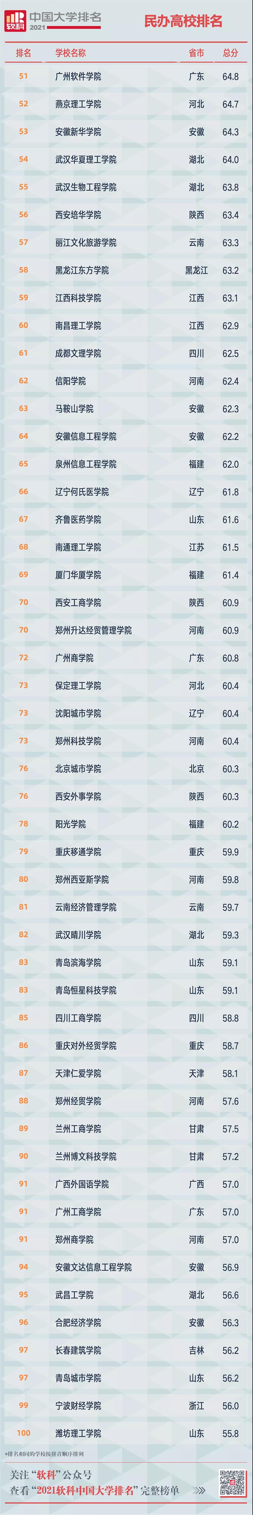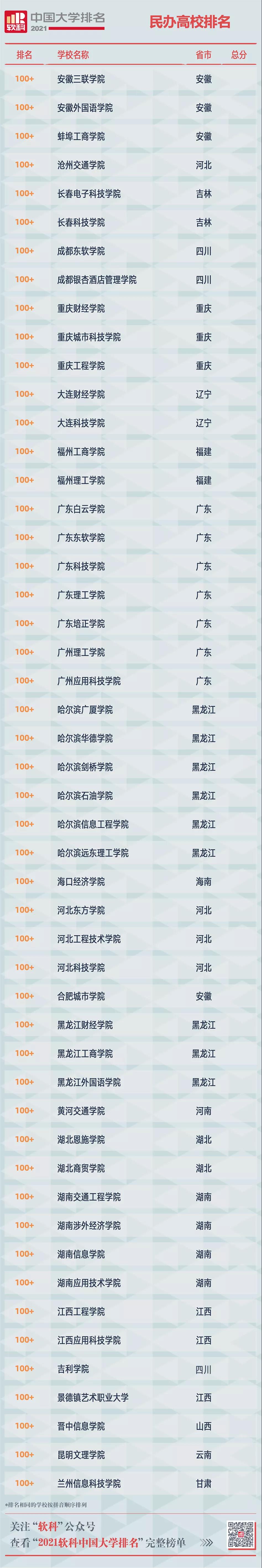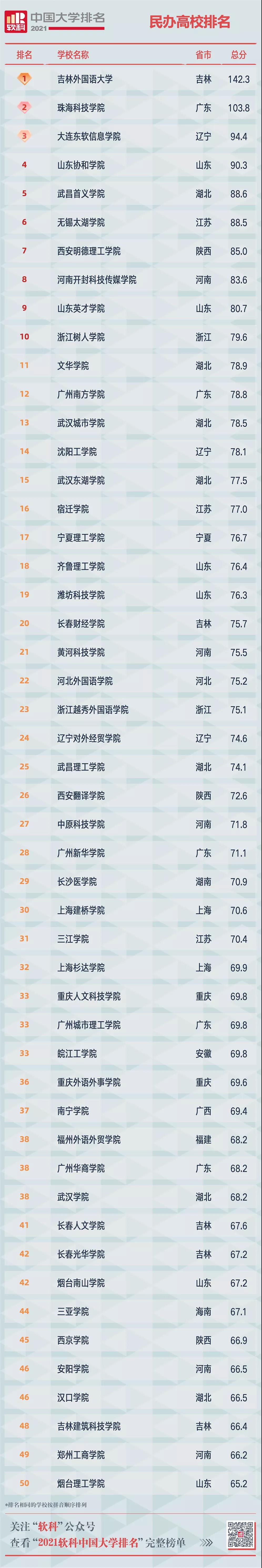 2021軟科中國民辦高校排名上榜高校共192所,排名最高的三所學校是吉林外國語大學、珠??萍紝W院、大連東軟信息學院。2021軟科中國民辦高校排名榜單中有46所是由獨立學院轉設而來,其中23所位列2021中國民辦高校排名百強,體現(xiàn)了率先完成轉設的這批獨立學院的辦學實力,他們的轉設將發(fā)揮示范作用,推動中國民辦高等教育規(guī)范發(fā)展。