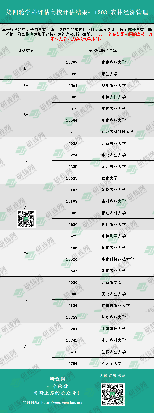 下面是全國第四輪學(xué)科評估結(jié)果 1203 農(nóng)林經(jīng)濟(jì)管理 的院校排名,供大家擇校參考。(注:評估結(jié)果相同的高校排序不分先后,按學(xué)校代碼排列)