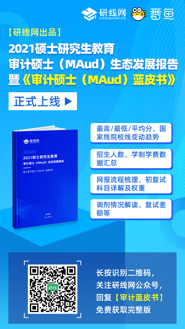 2021年7月7日上午10點,【研線網出品】2021碩士研究生教育審計碩士(MAud)生態發展報告暨《審計碩士(MAud)藍皮書》(以下簡稱“22考研審計擇校藍皮書”)正式發布!