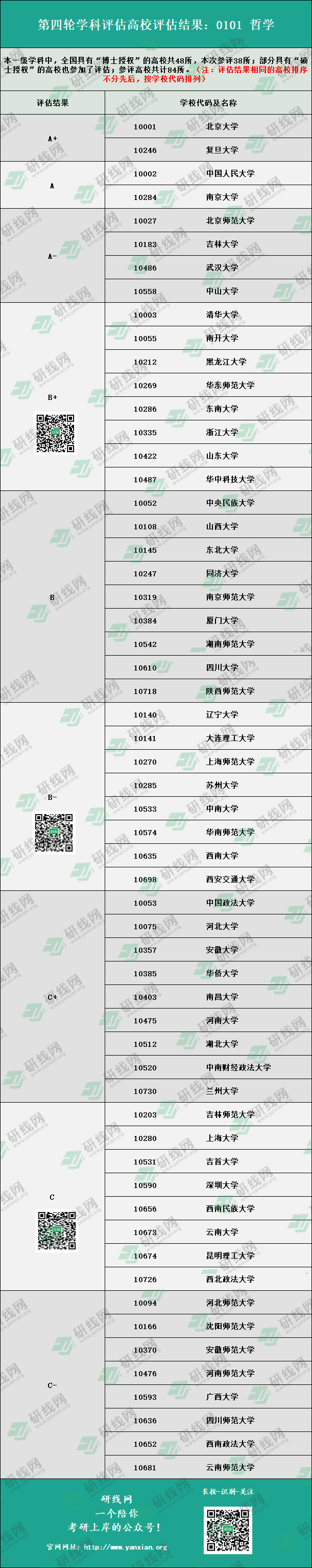 下面是全國第四輪學(xué)科評估結(jié)果 10101 哲學(xué) 的院校排名,供大家擇校參考。(注:評估結(jié)果相同的高校排序不分先后,按學(xué)校代碼排列)