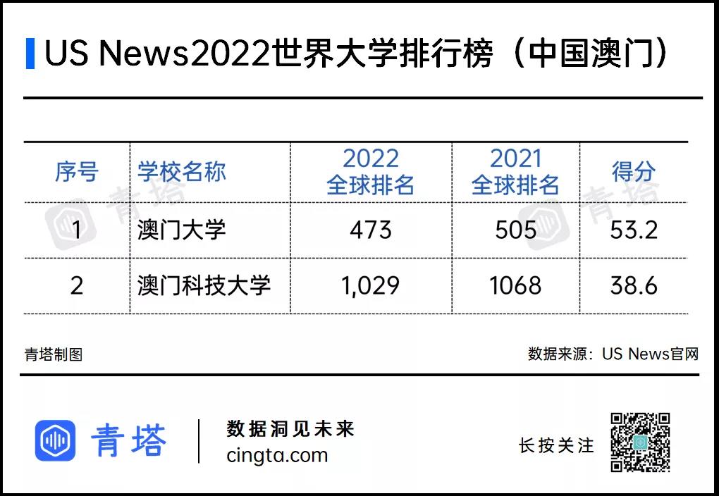 中國澳門地區共有2所高校上榜,其中澳門大學位居全球473位,澳門科技大學居全球1029位。