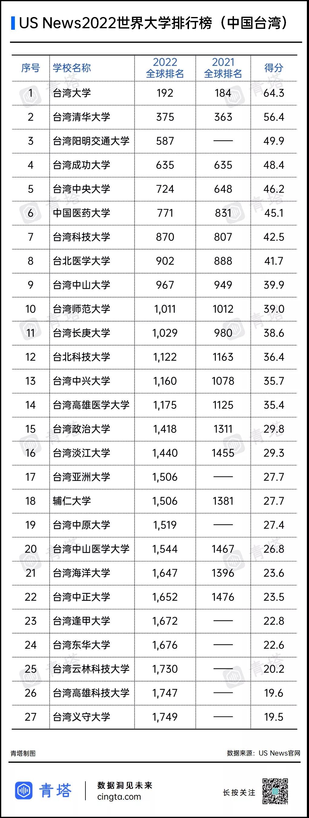 中國臺灣地區共有27所高校上榜,其中排名最高的是臺灣大學,排名全球192位。