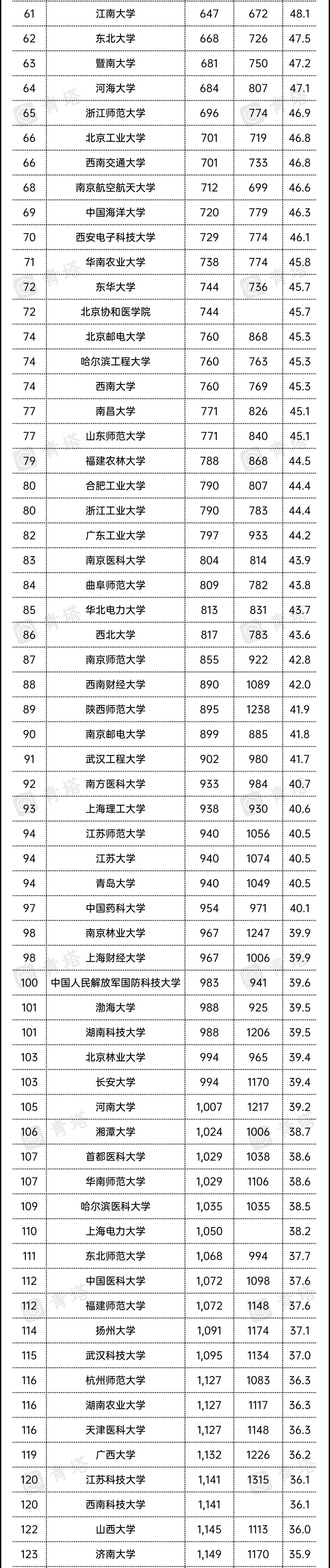 今年,中國內地共有11所大學進入全球200強,比去年增加3所。除了清華和北大,另外九所高校分別是上海交通大學(105名)、中國科學技術大學(110名)、浙江大學(115名)、南京大學(135名)、復旦大學(141名)、中山大學(159名)和中國科學院大學(159名)、華中科技大學(176名)、湖南大學(195名)。此外,排名靠前的高校還包括哈爾濱工業大學、武漢大學、同濟大學、中南大學、華南理工大學、東南大學、西安交通大學等。