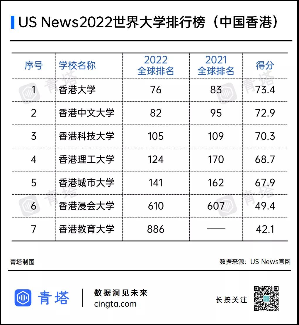 中國香港地區共有7所高校上榜,排名最高的是香港大學,居全球76位。