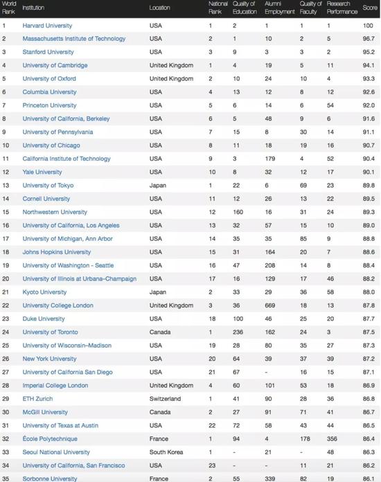 CWUR世界排名:美英高校稱霸排名
